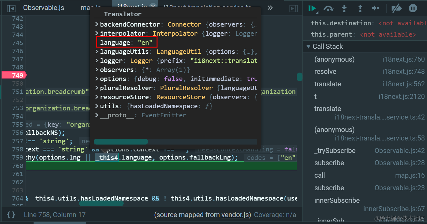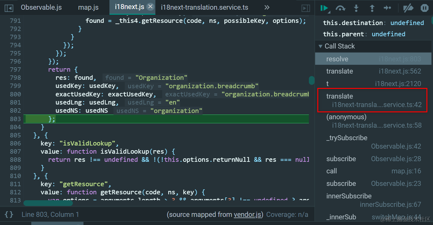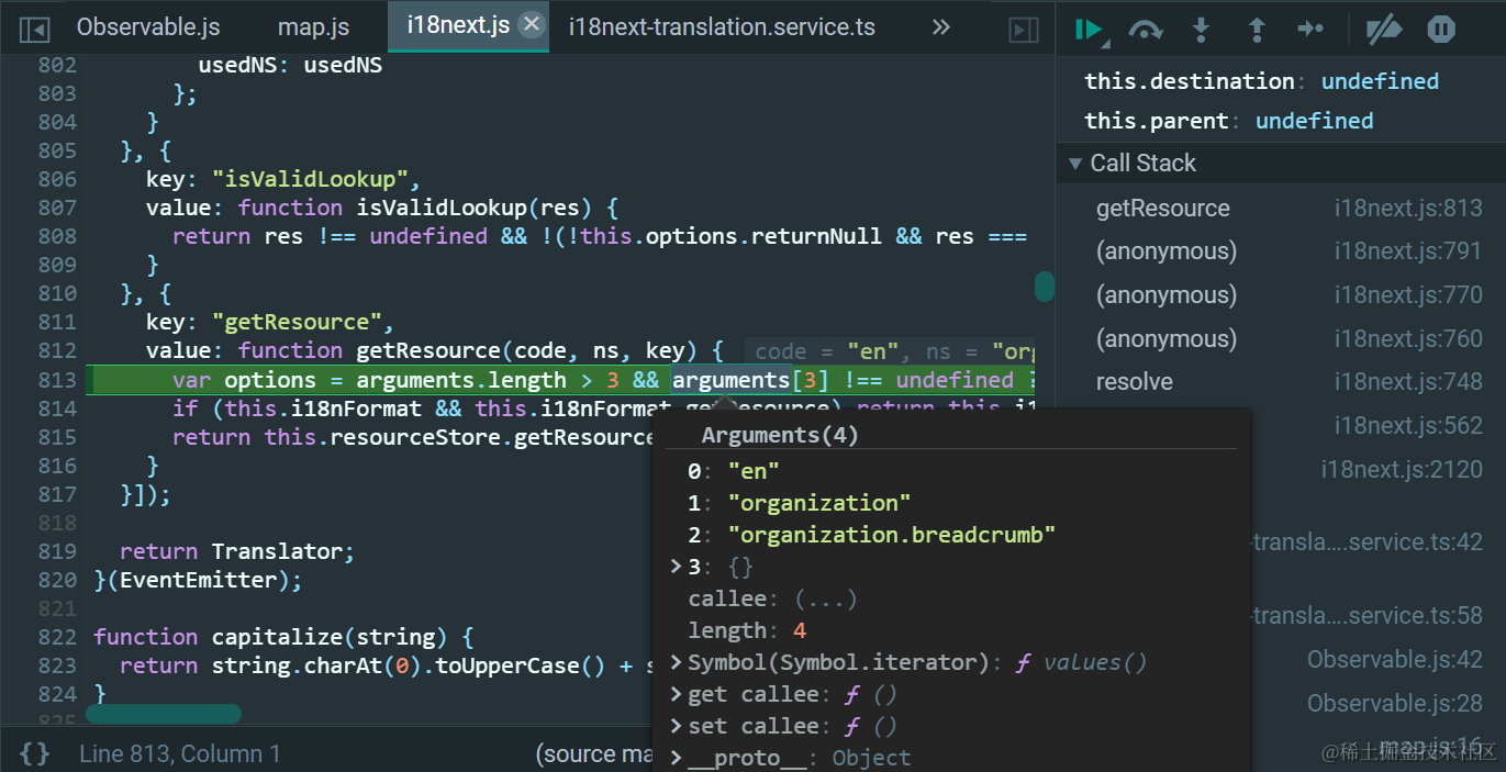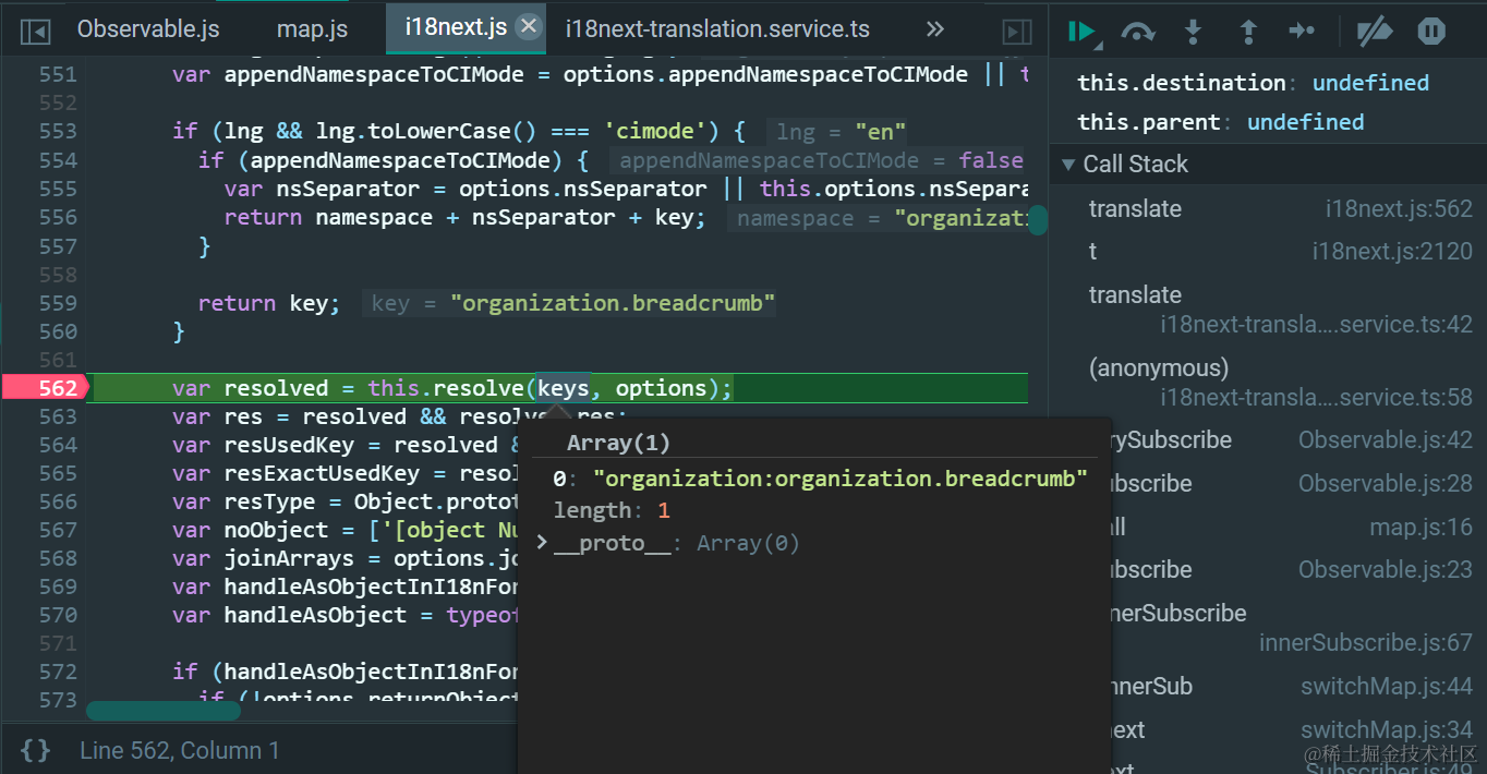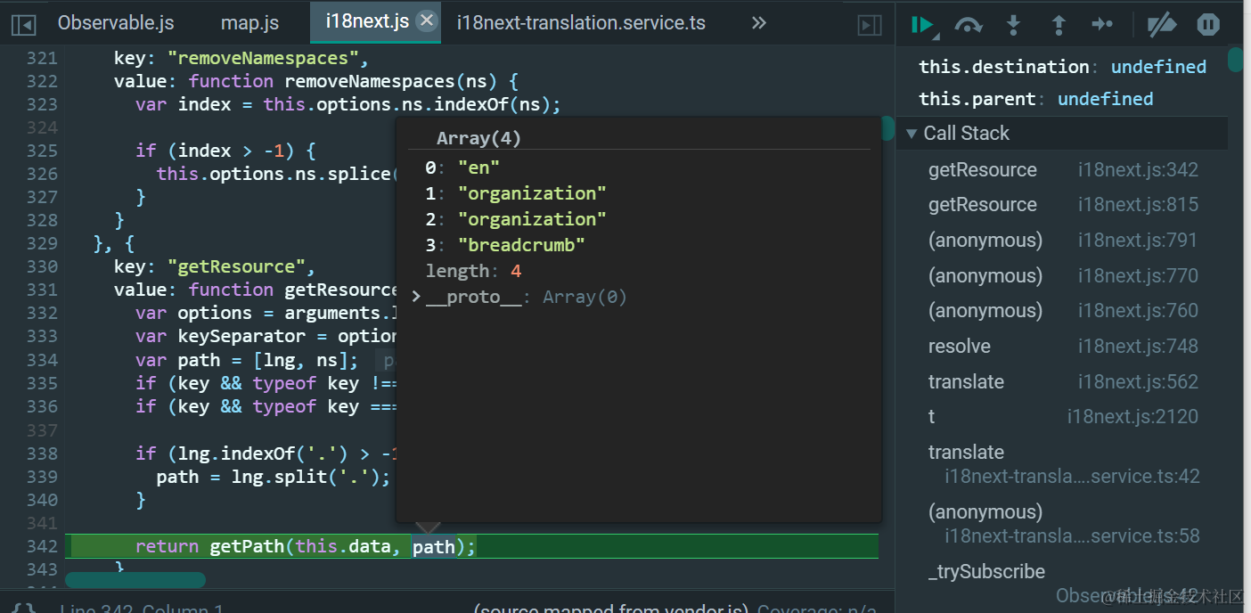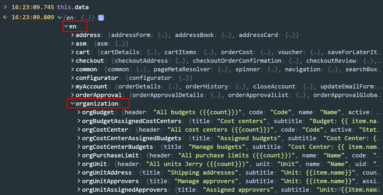 Angular应用i18n - internationalization翻译的实现单步调试 已注销 2021-04-26 316 阅读1分钟 translate方法是入口: this.i18next.t是Angular lib的实现: this.resolve方法一旦执行完毕后,resolved存储的就是翻译后的结果: 默认的language是en: 待翻译文本的key: 上图第342行,this.data, 包含了所有待翻译的路径: 最终的结果: 更多Jerry的原创文章,尽在:“汪子熙”: