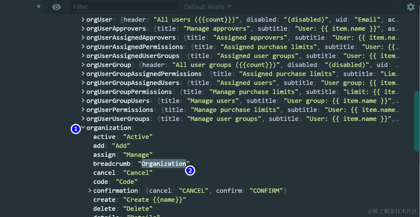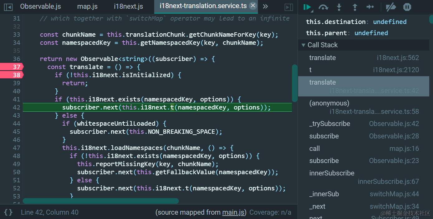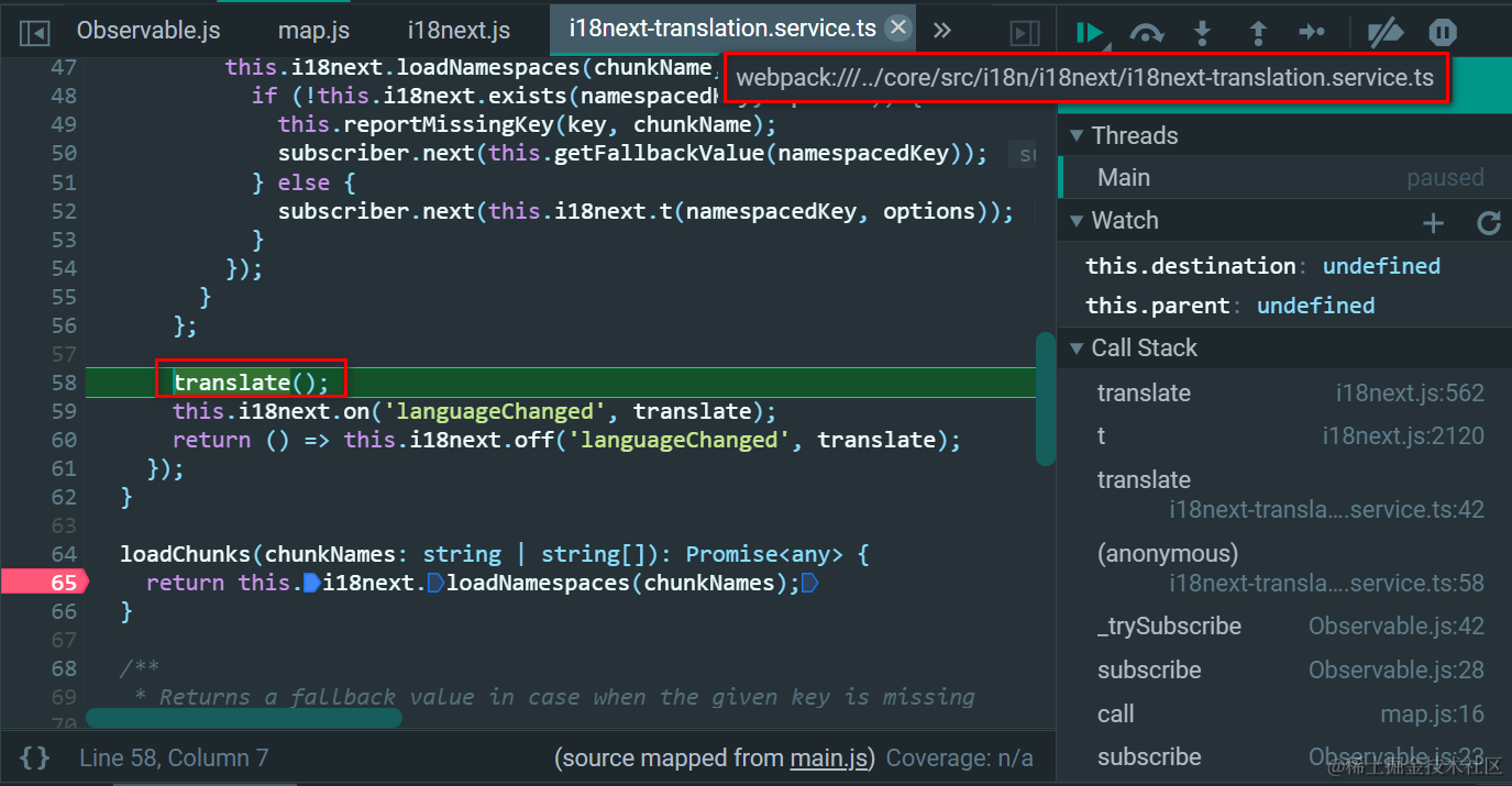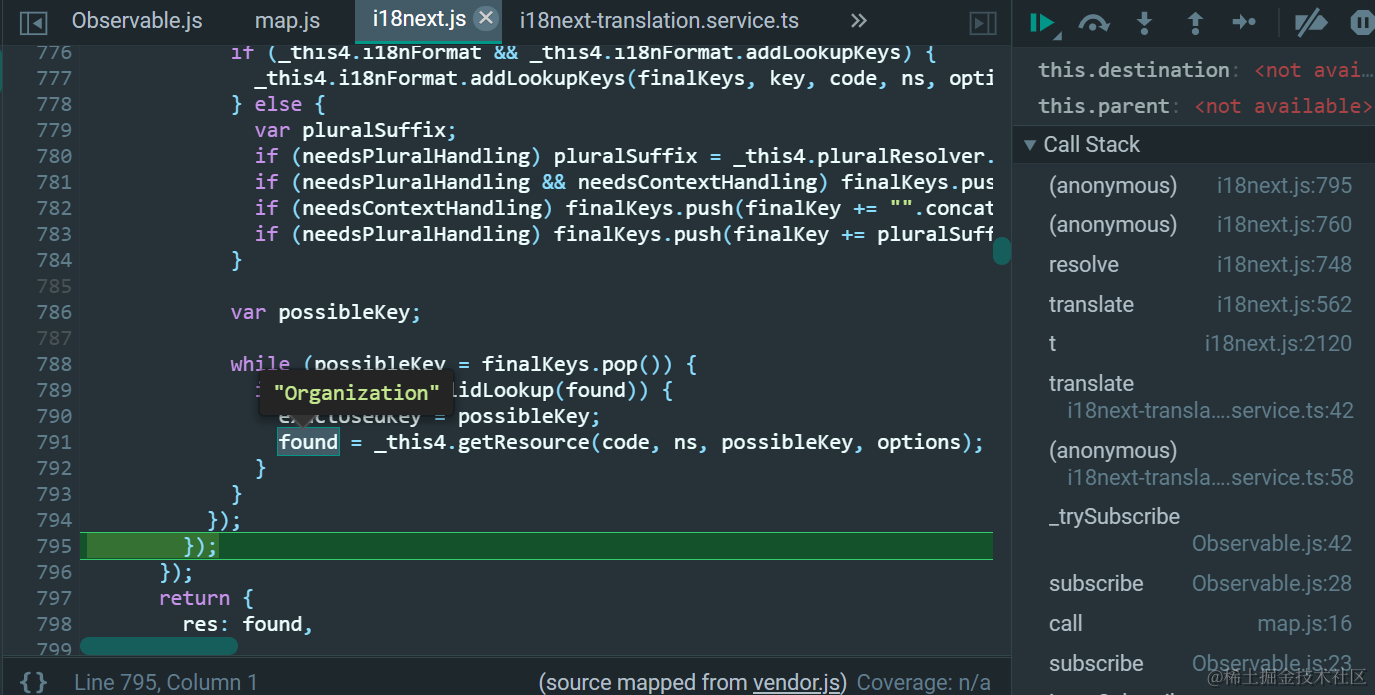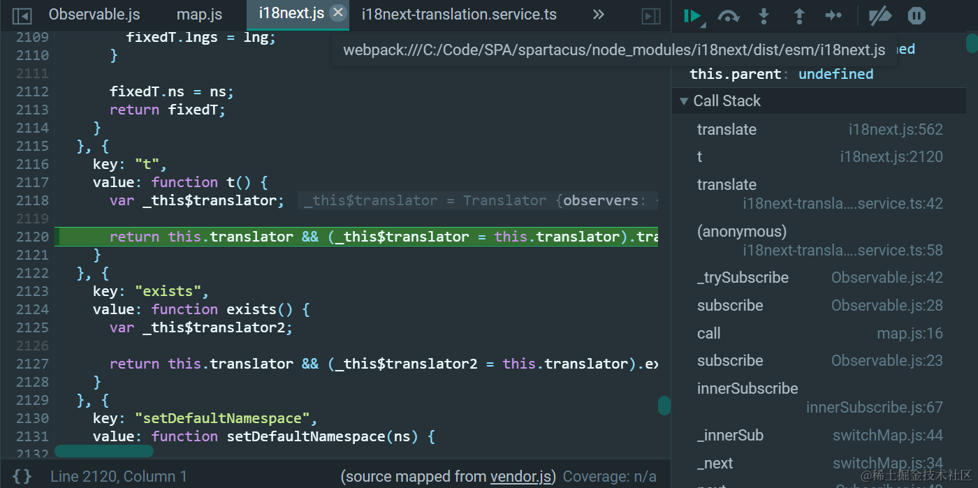 Angular应用i18n - internationalization翻译的实现单步调试 已注销 2021-04-26 316 阅读1分钟 translate方法是入口: this.i18next.t是Angular lib的实现: this.resolve方法一旦执行完毕后,resolved存储的就是翻译后的结果: 默认的language是en: 待翻译文本的key: 上图第342行,this.data, 包含了所有待翻译的路径: 最终的结果: 更多Jerry的原创文章,尽在:“汪子熙”: