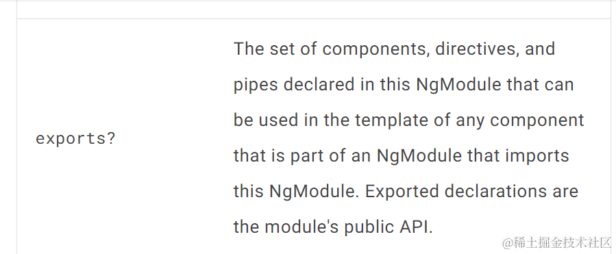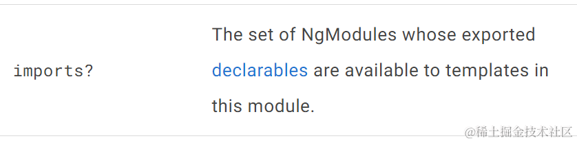 假设module A 导入了module B,则module A的declarations区域的所有Component,能使用module B的exports区域定义的Component: