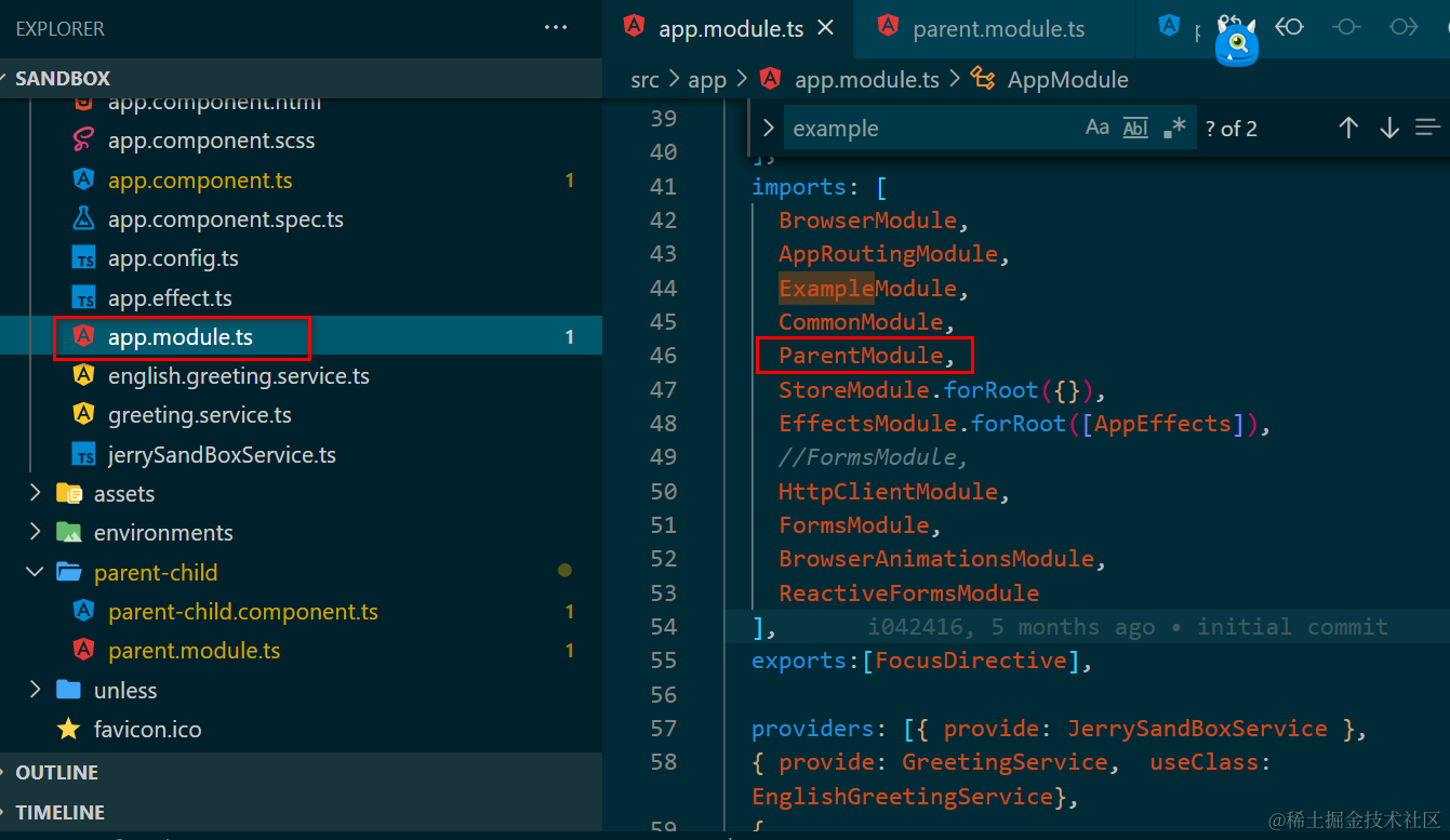 AppModule导入了ParentModule,因此其能使用后者export区域暴露的Component: