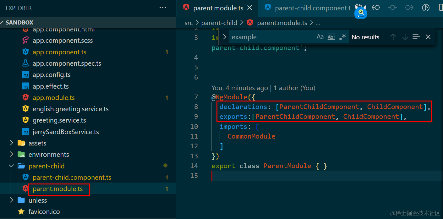 在parent.module.ts定义里,检查exports区域里是否包含了selector app-parent-child对应的Angular Component:ParentChildComponent: