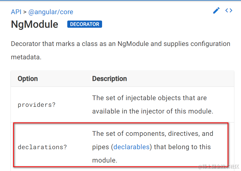 declarations: 定义了该NgModule的组成部分:Components, directives和pipe等。