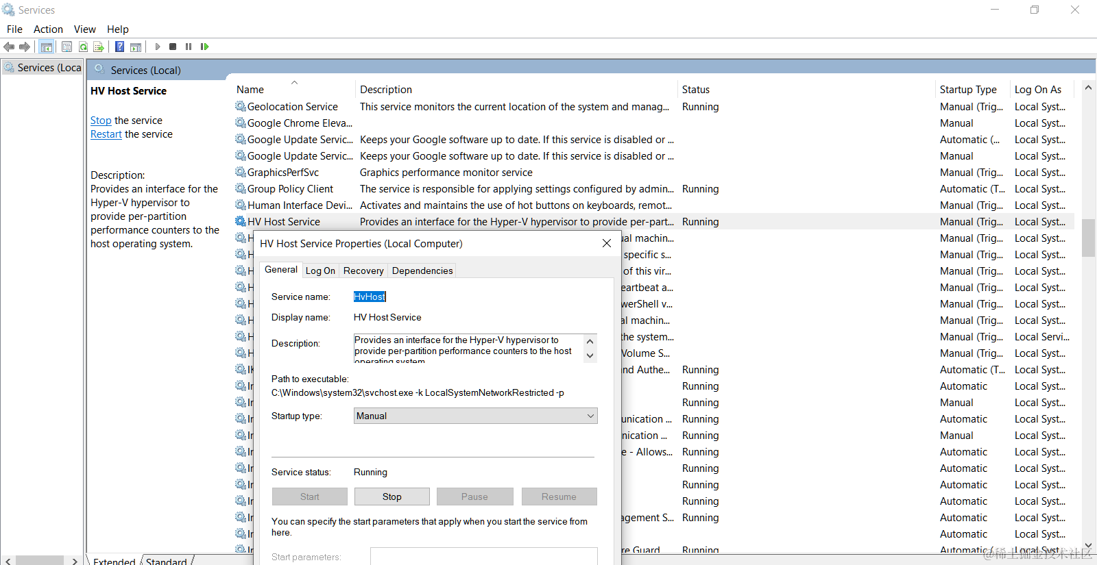 确保和Hyper V相关的服务,只有下列服务处于running状态: