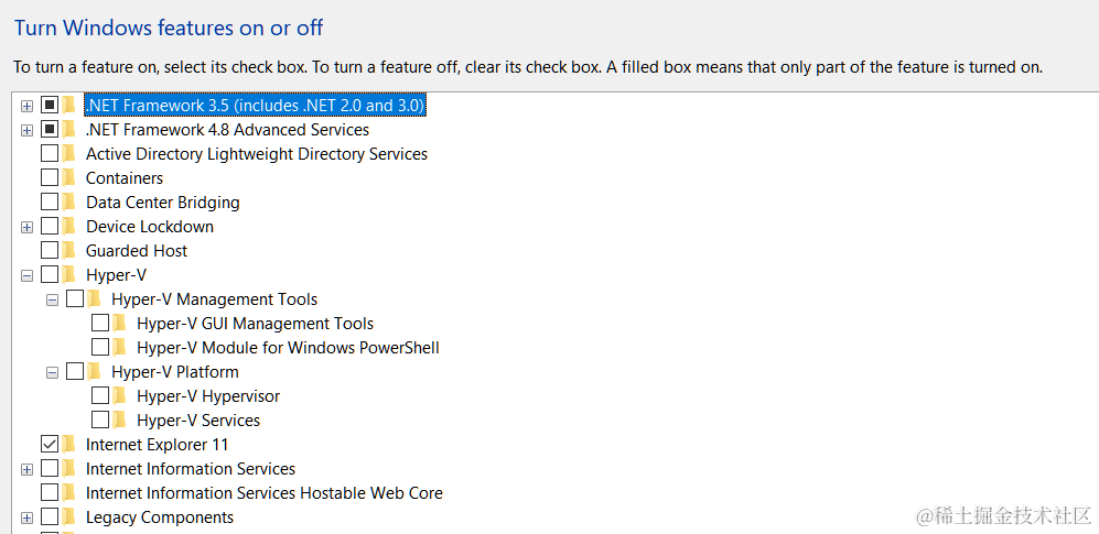 在Turn windows features on or off里,将Hyper-V相关的选项前的checkbox全部取消: