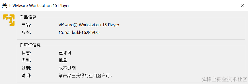 我在Windows10安装VMWare workstation 15 Player,版本信息如下: