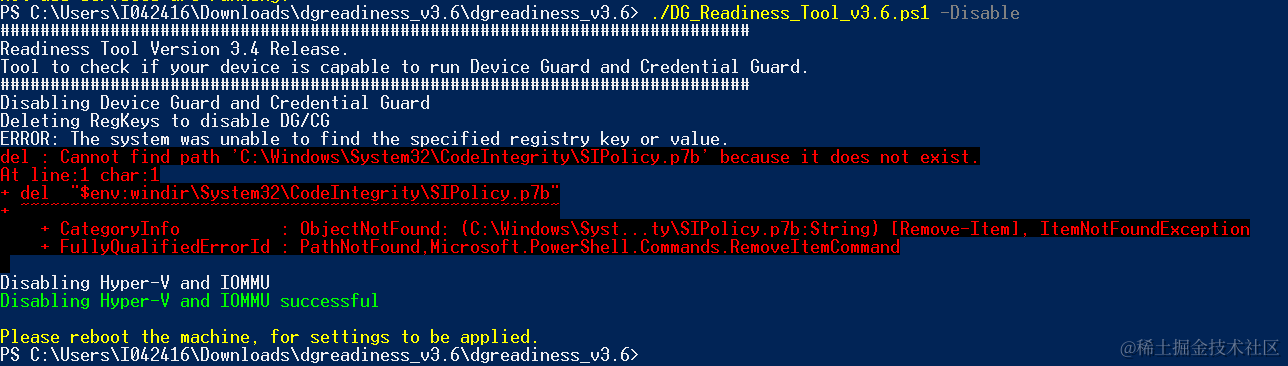 显示绿色的Disabling Hyper-V and IOMMU successful, 说明脚本执行成功了。