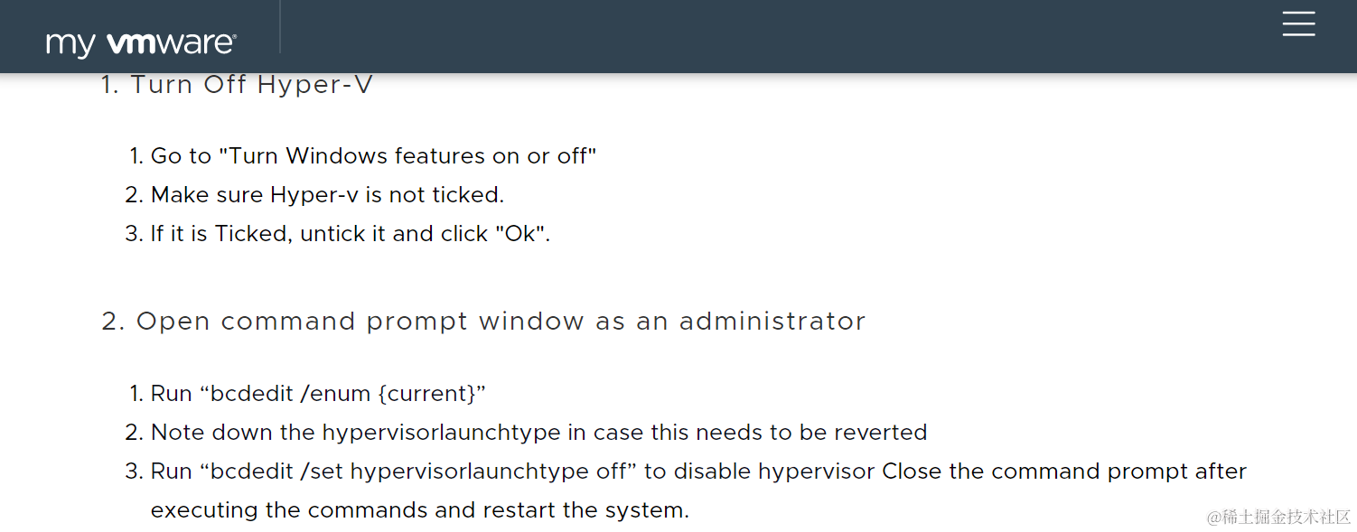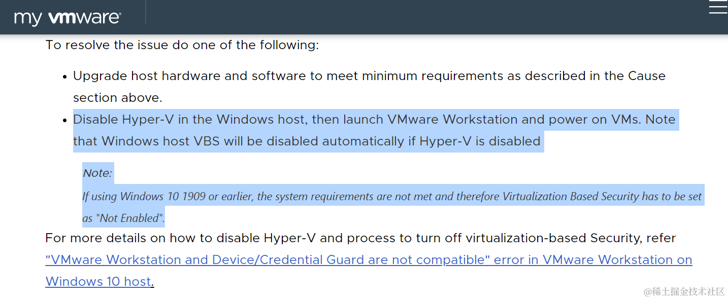 对于我这个Windows10版本,如果想使用VMWare workstation player 15.5.5,VMWare官网给出的解决方案是:在windows宿主机里禁掉Hyper-V,同时禁掉Virtualization-based Security(简称VBS):