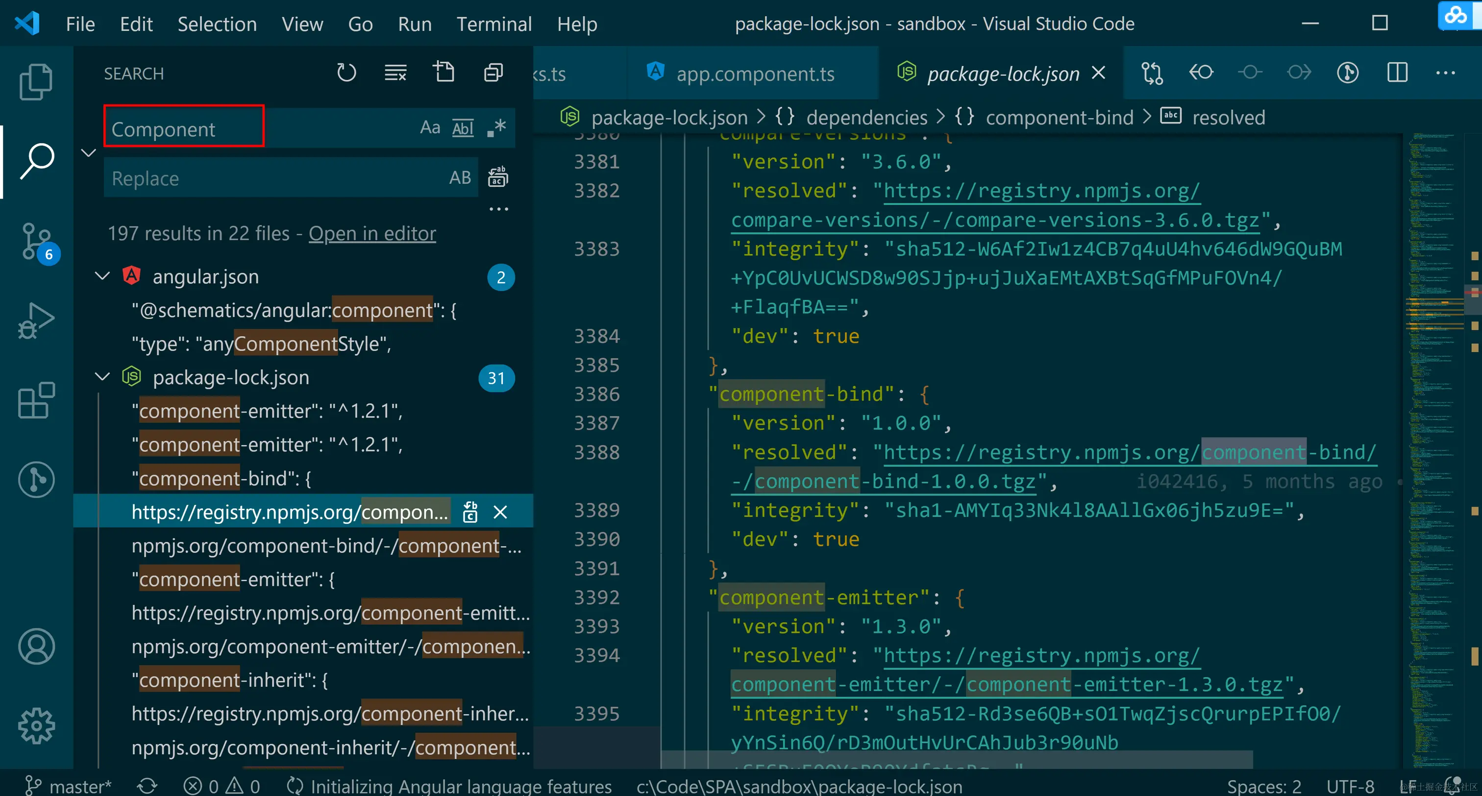 使用方式和sublime text类似。输入Component,回车,左侧搜索面板会自动列出包含Component的文件,以及Component的总共出现次数。单击任意一个出现位置,即可在右侧文件显示视图里,自动定位到Component出现的地方。