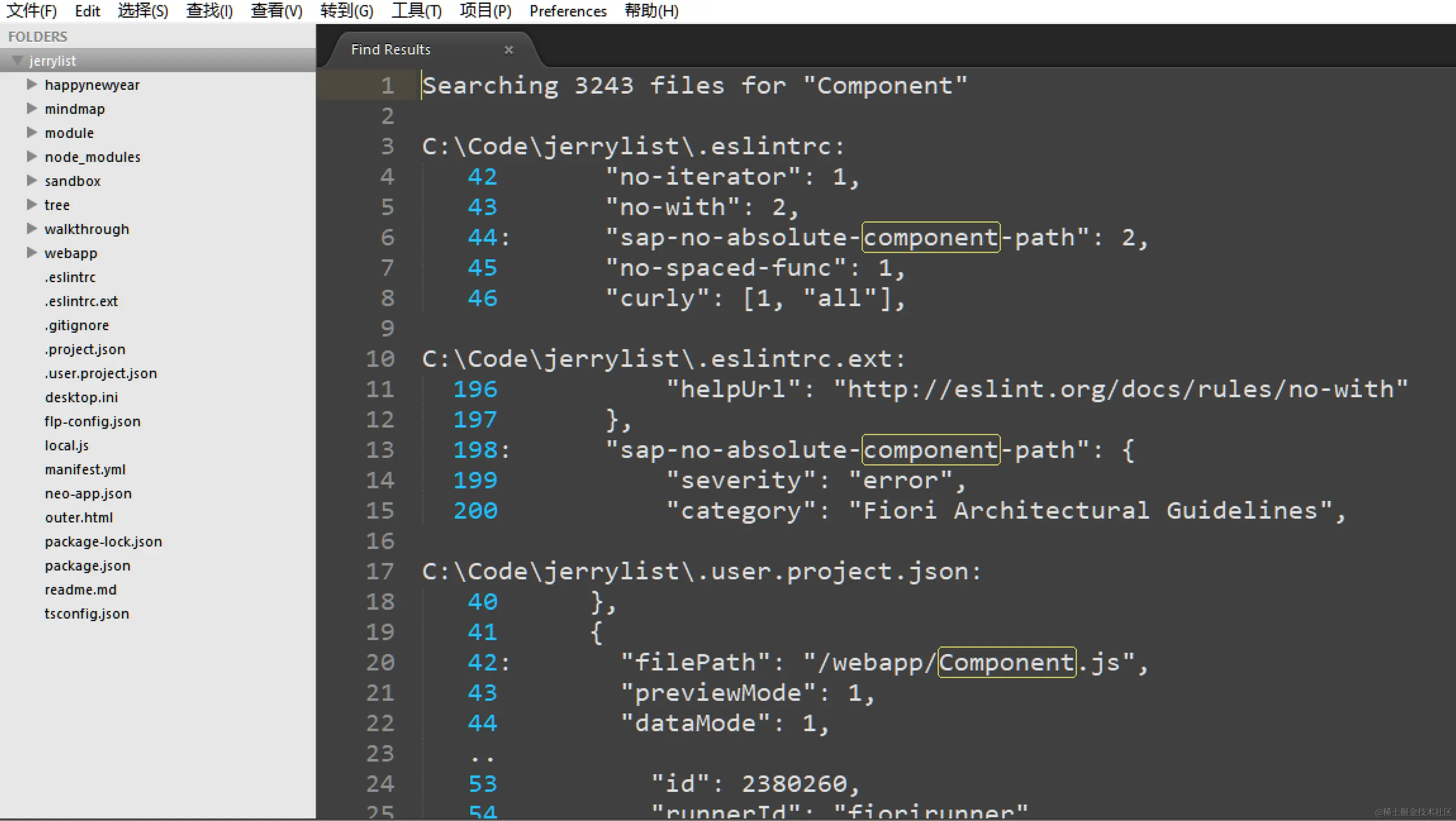 输入Component,回车,sublime text会自动列出包含了Component的所有文件,以及Component在这些文件中的具体位置: