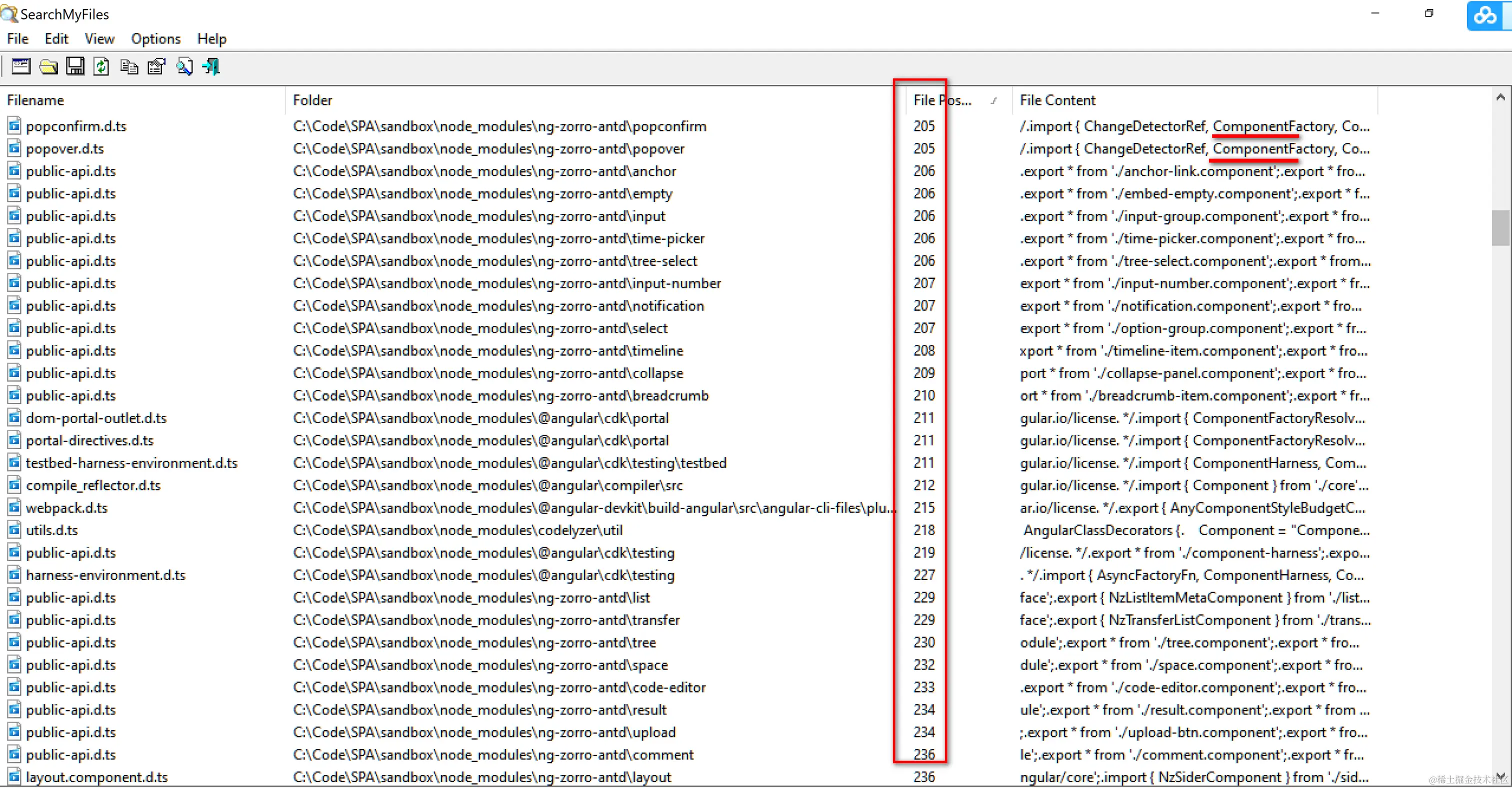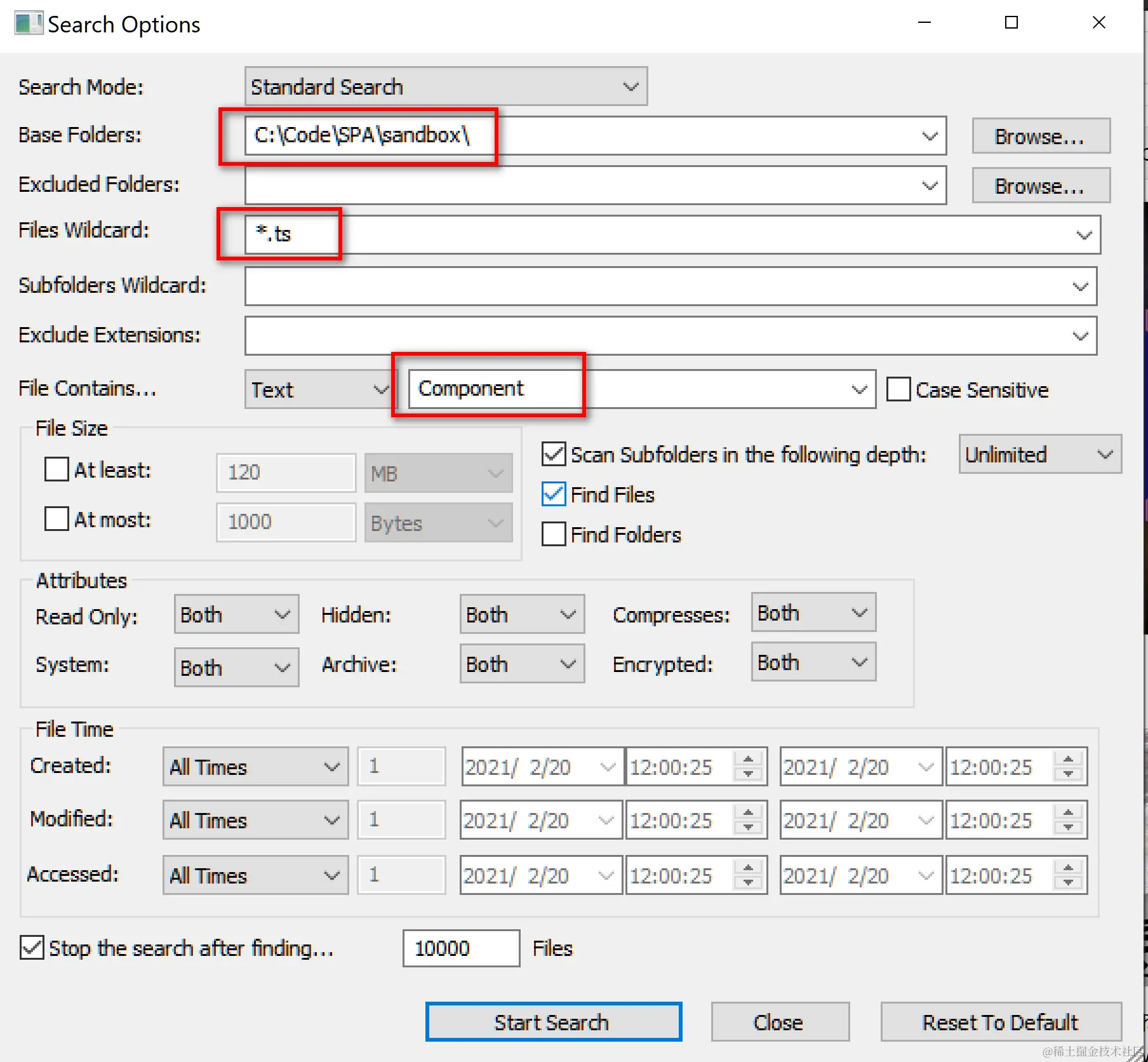 比如下面的搜索参数设置,意思是在文件夹C:\Code\SPA\sandbox\里,搜索所有包含了字符串“Component”的扩展名为.ts的文件: