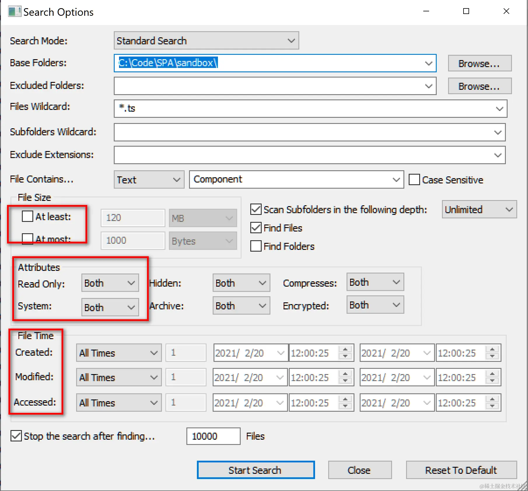 除了根据字符串搜索外,SearchMyFiles还支持搜索指定文件大小或大小区间,根据文件属性(只读文件,系统文件,压缩文件),和文件创建/修改/访问时间搜索: