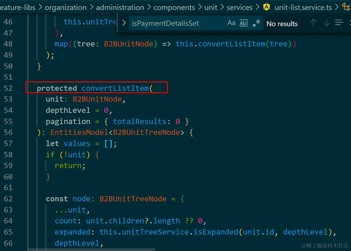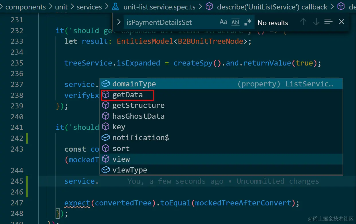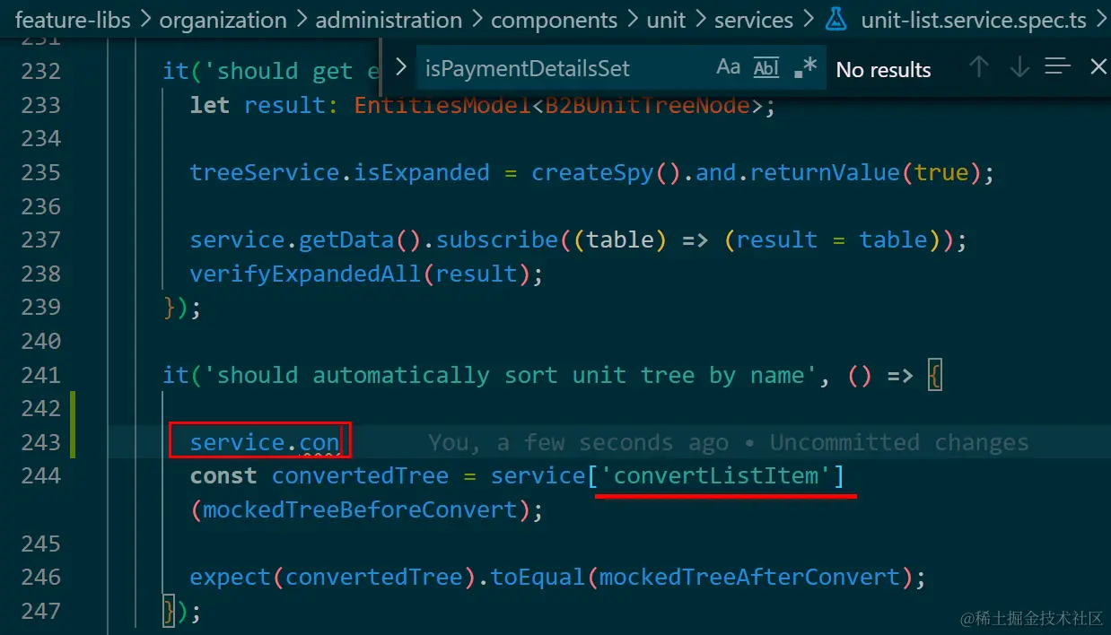 我直接敲service., Visual Studio Code的代码自动完成列表里,没有出现convertListItem,因为它是protected方法。但我们要知道,因为Angular TypeScript编译后生成的是JavaScript代码,而JavaScript里是不存在protected方法概念的,因此我们可以使用第244行这种动态调用的方式,实现在运行时仍然能够执行convertListItem方法的目的。