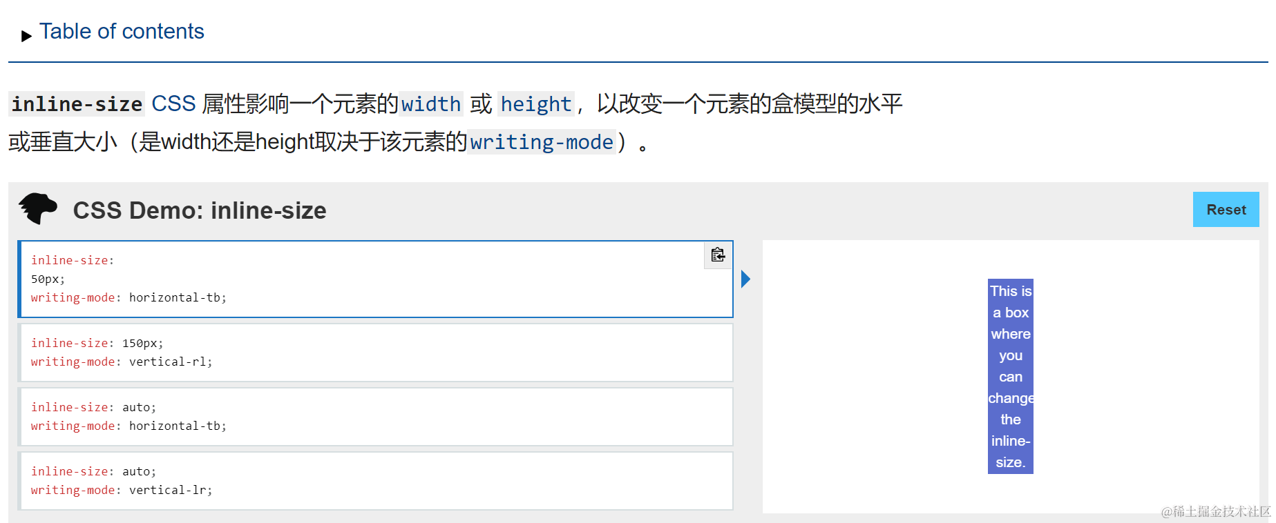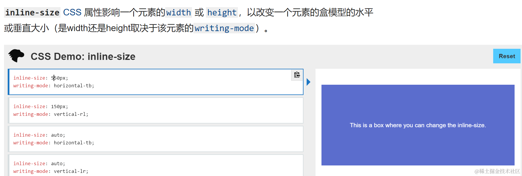 inline-size影响一个元素的width或height,进而改变一个元素的box model的width或者height,取决于元素的writing-mode.