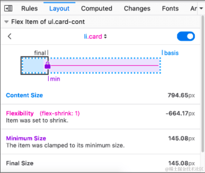 - Minimum Size (only appears when an item is clamped to its minimum size) - the minimum content size of a flex item when there is no more free space in the flex container