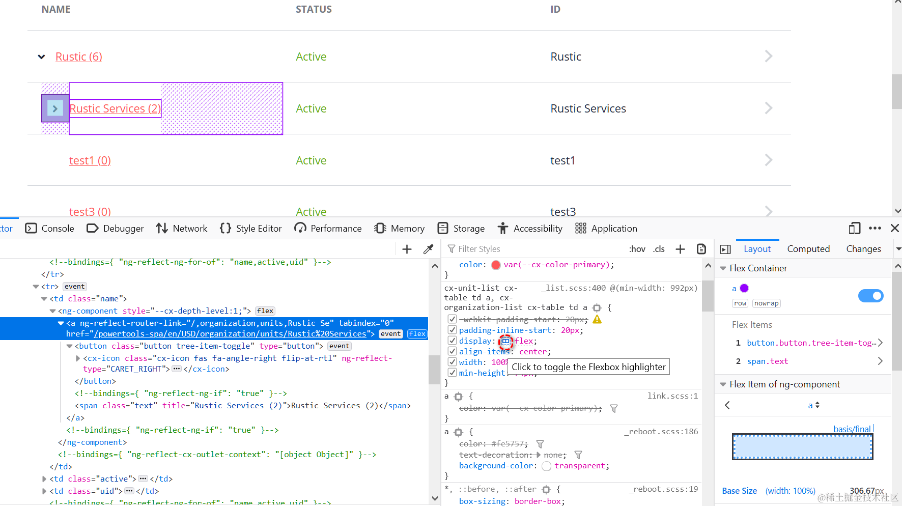 点击flex小图标,可以把flex container及其元素的轮廓高亮显示: