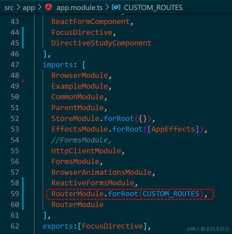 我将RouterModule.forRoot返回的Module放到app.module.ts的imports区域之后: