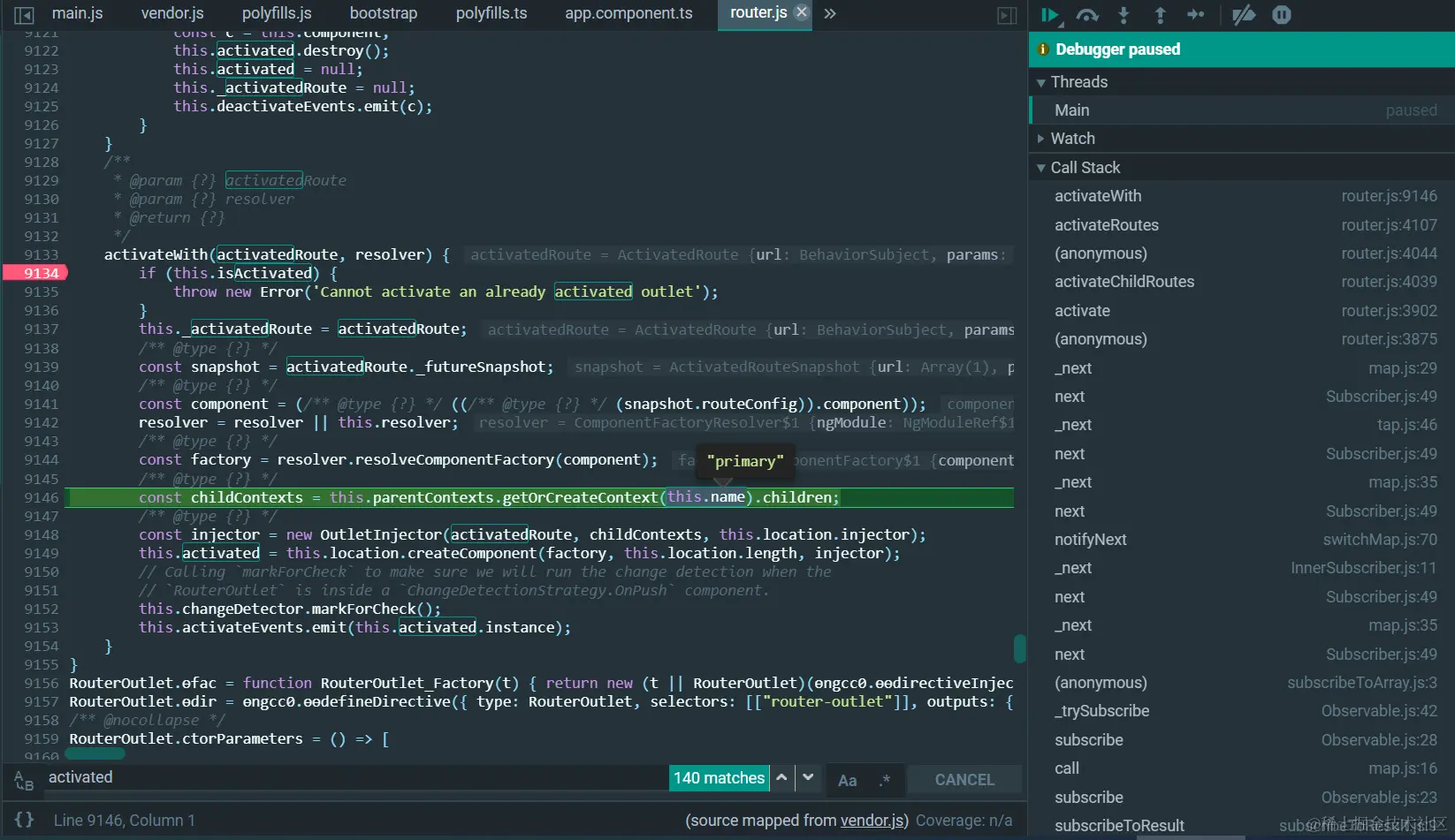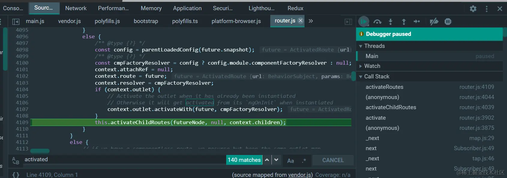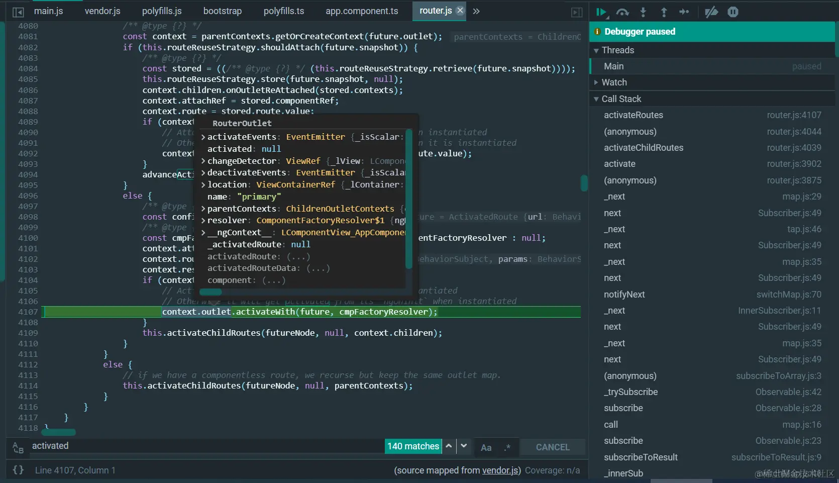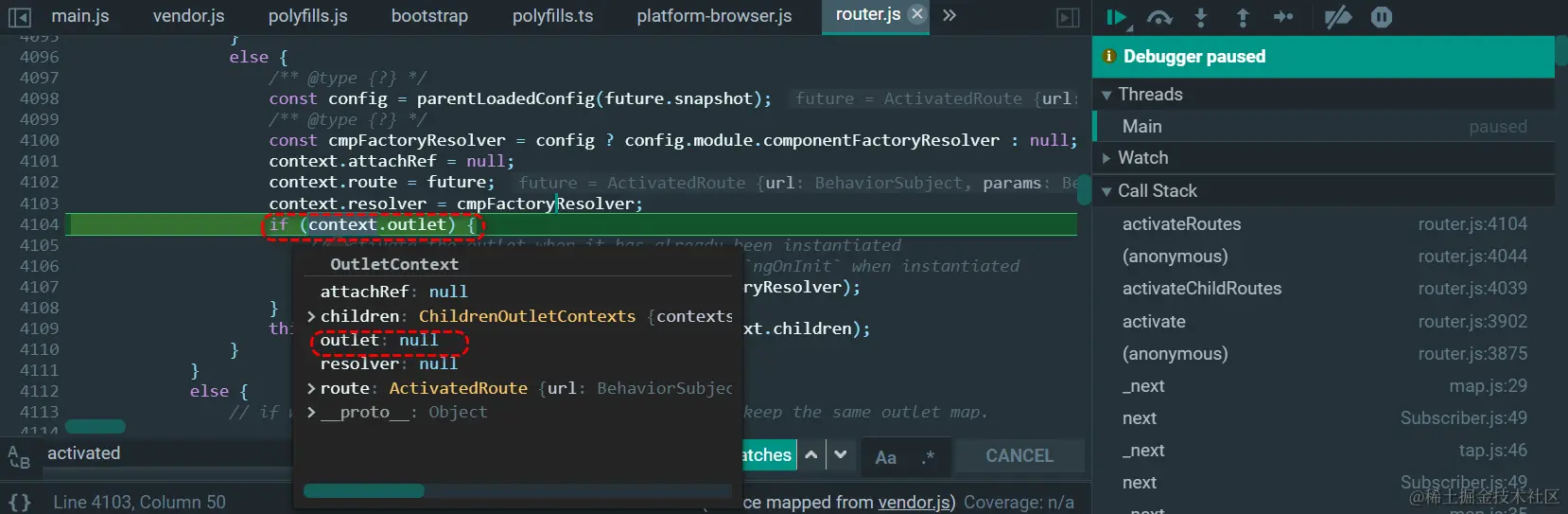 为什么Angular的路由执行离不开router-outlet标签 已注销 2021-04-26 74 阅读1分钟 做一个实验,如果把第53行包含router-outlet的代码注释掉: 则在运行时,context.outlet为null: 如此一来,没有机会执行第4107行的代码了: context.outlet.activatedWith(future, cmpFactoryResolver); RouterOutlet里包含的有用信息: 整个这段代码都是在router-outlet的实现上下文里执行的。 更多Jerry的原创文章,尽在:“汪子熙”: