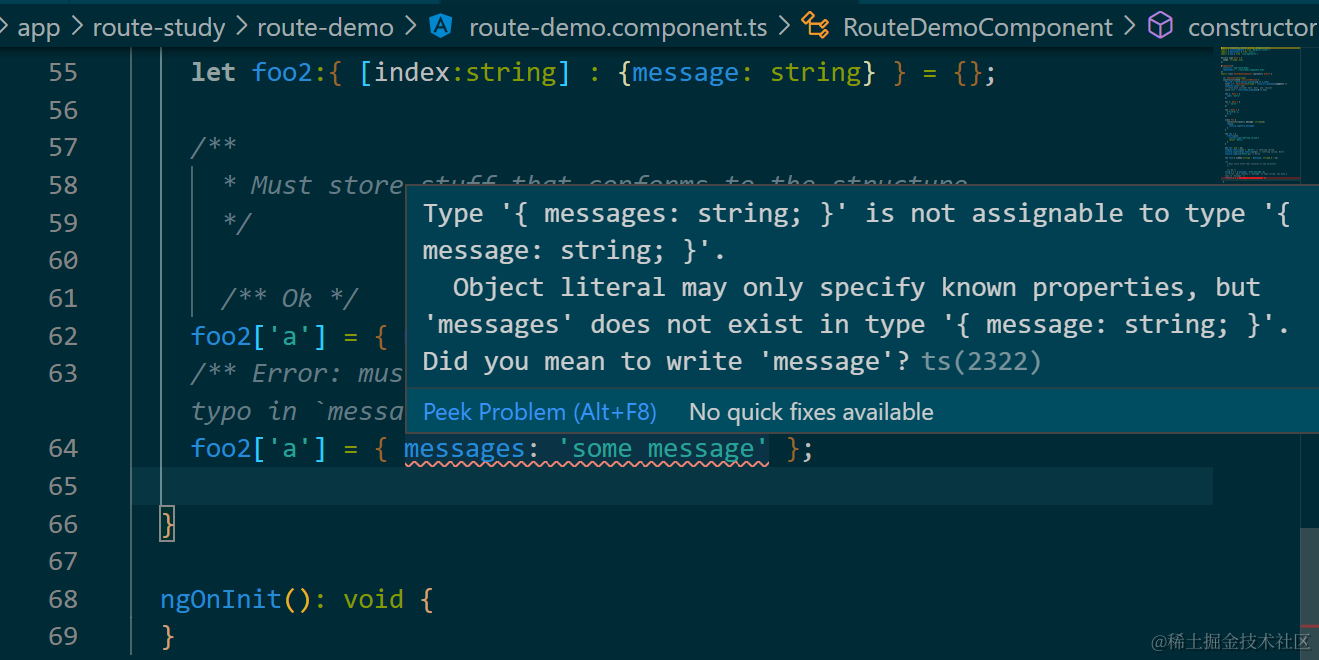 foo2是一个对象,包含了一个index signature,类型为字符串。名称可以任意取,该index指向另一个对象,该对象必须包含一个字段message,值为string.