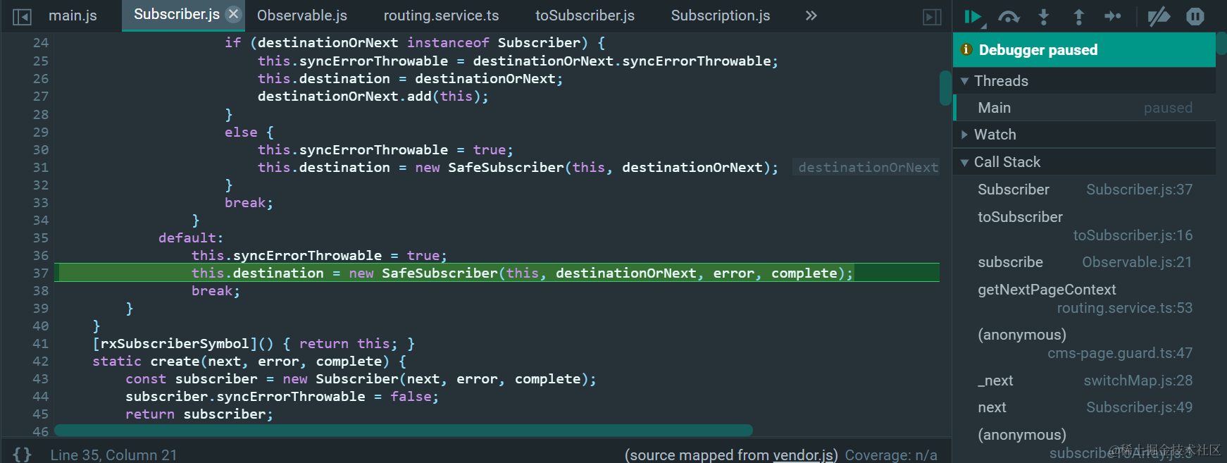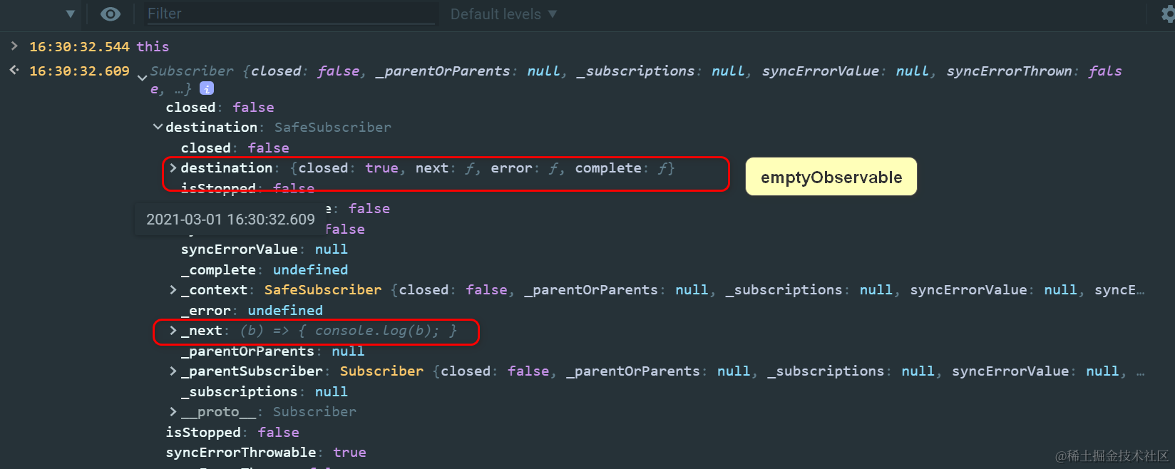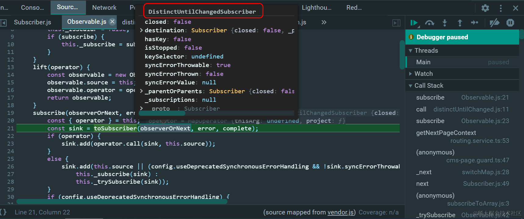 上图第21行的变量ObserverOrNext, 即我们指定到subscribe调用里的回调函数。