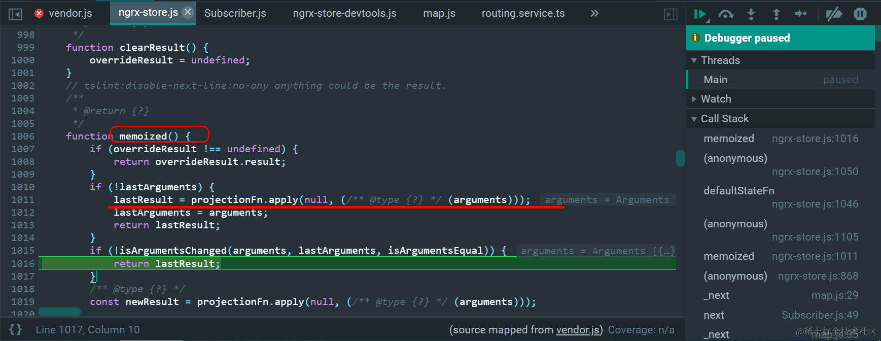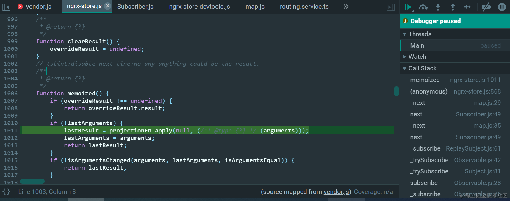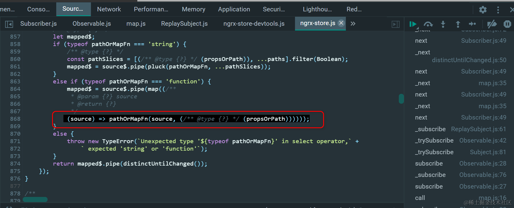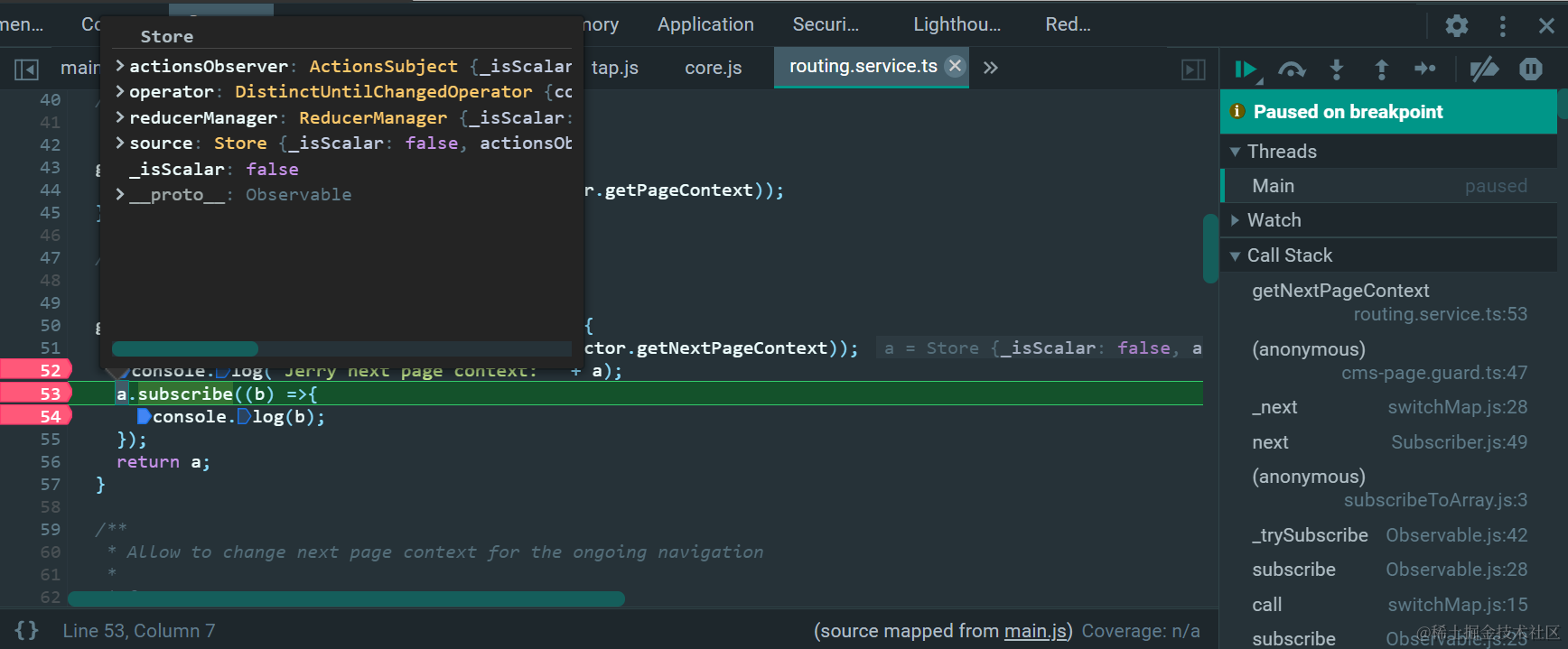 执行到53行时,再切换到ngrx-store.js里,设置断点: