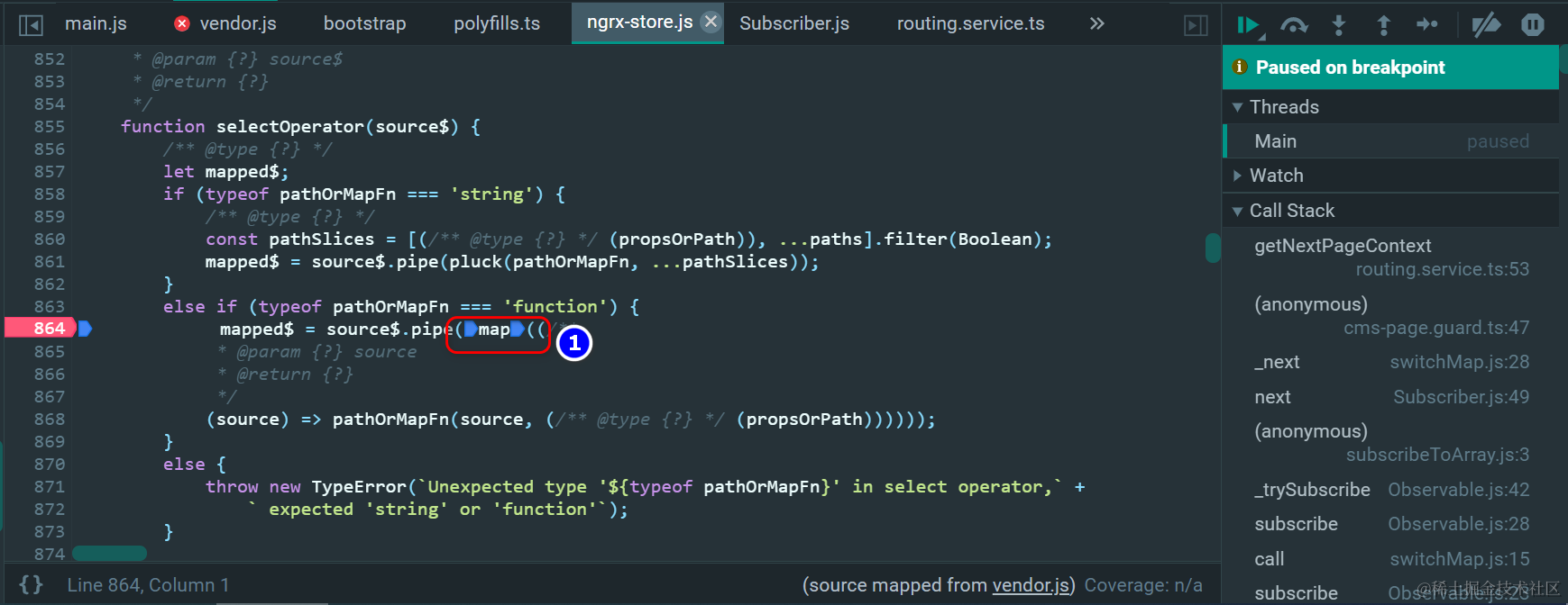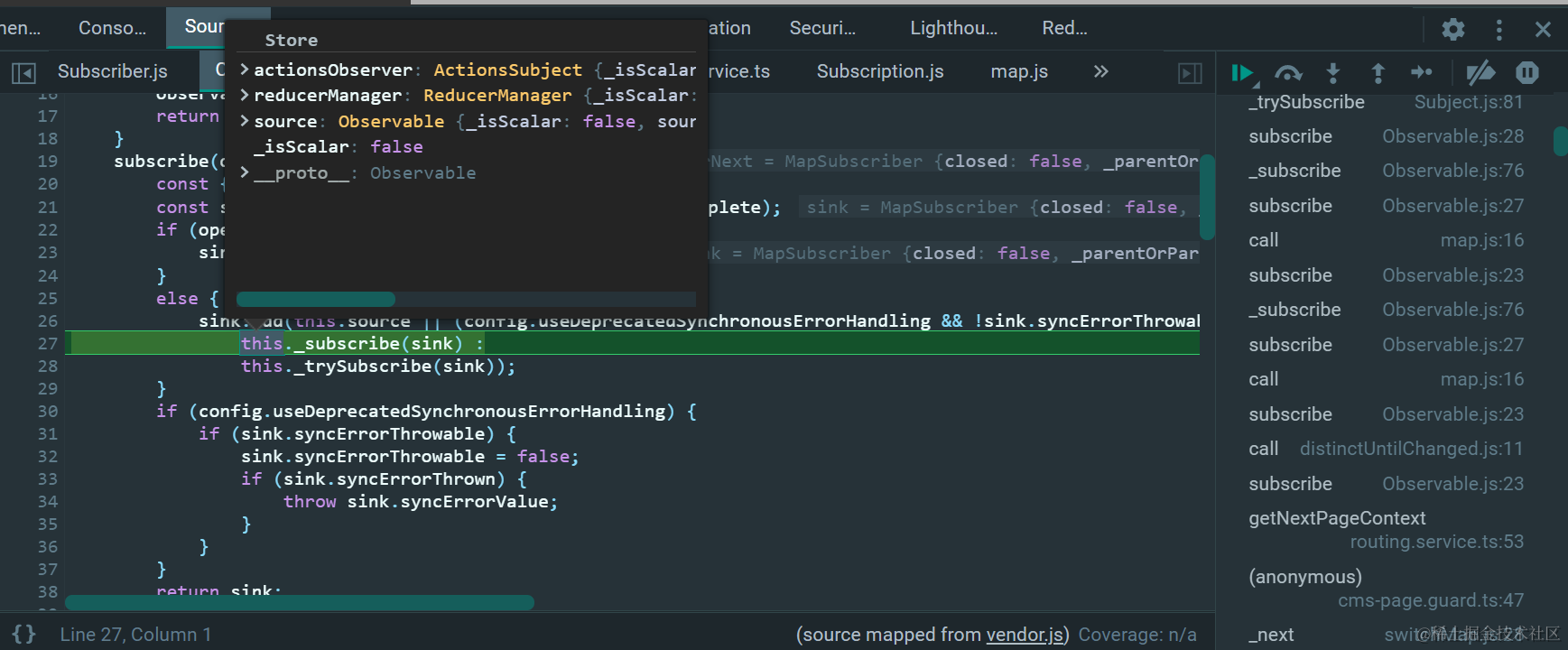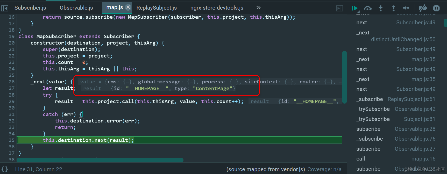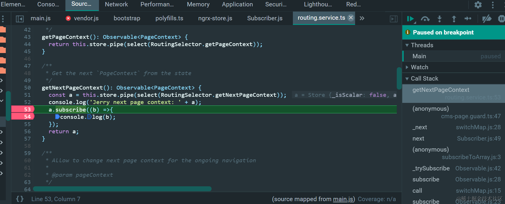 执行到53行时,再切换到ngrx-store.js里,设置断点:
