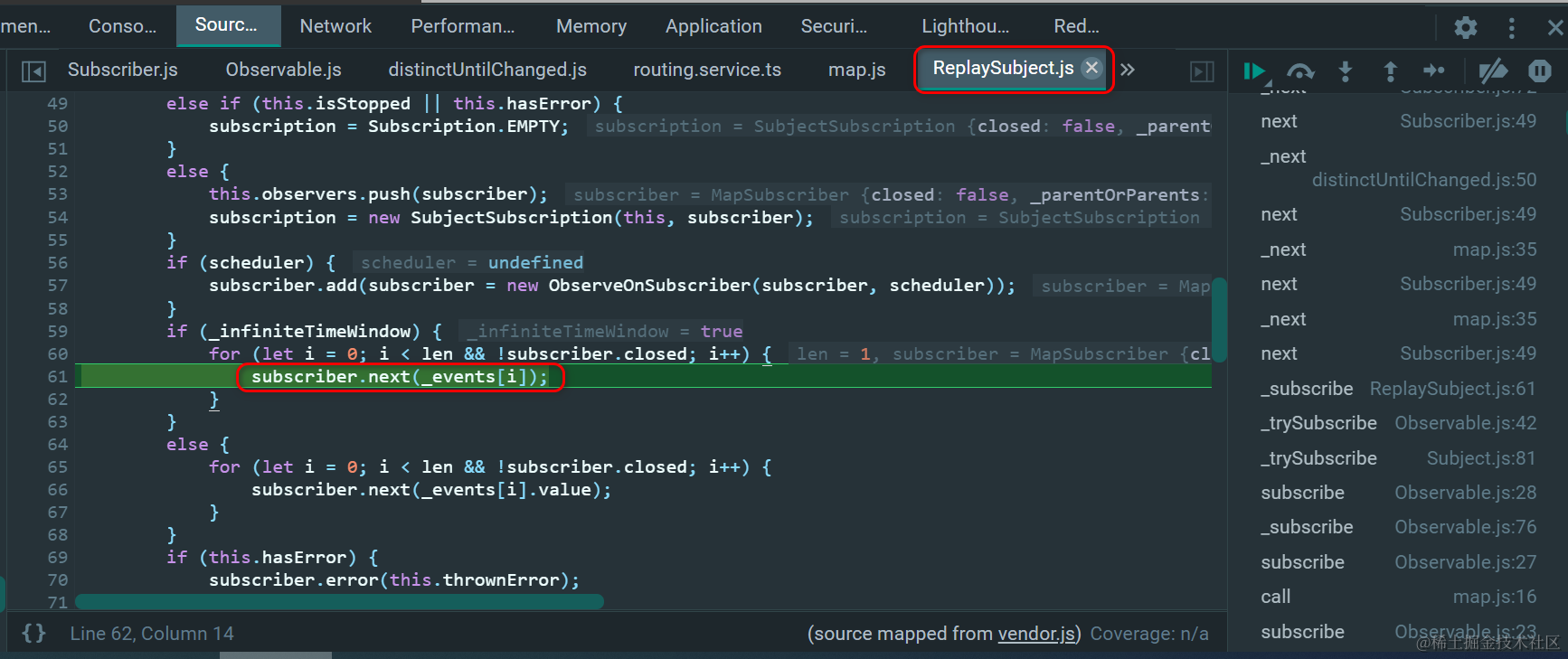 在ReplaySubject.js里,手动调用subscriber的next方法: