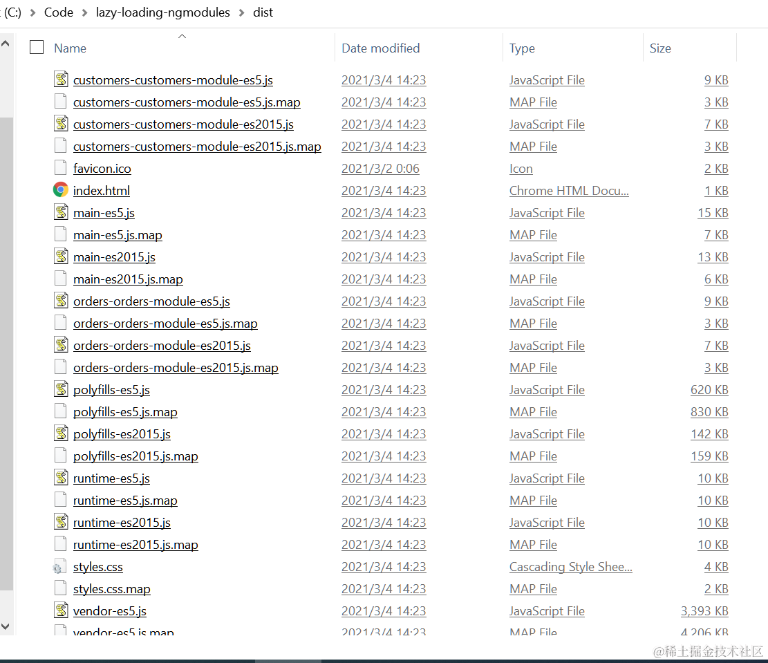 执行ng build之后,这次发现main chunk和customers以及orders chunk分别进行打包了,这说明Customers和Orders的lazy loading启用生效了。