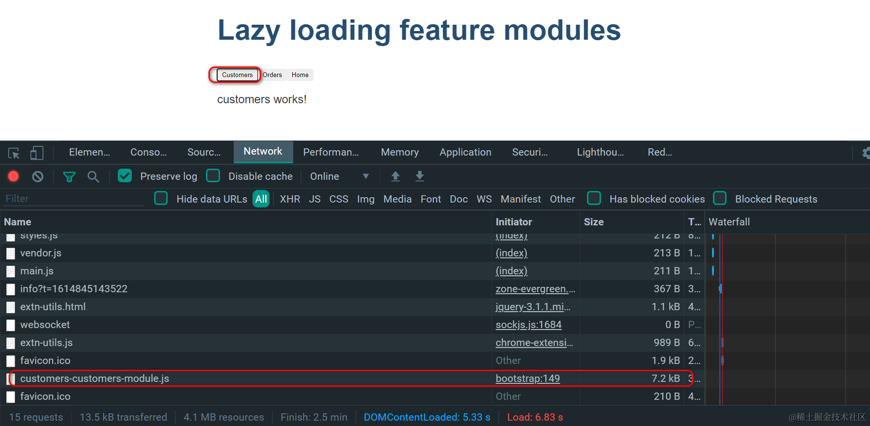 直到此时,才观察到了customers chunk,这就是Angular Component 懒加载模式在运行时的表现效果。