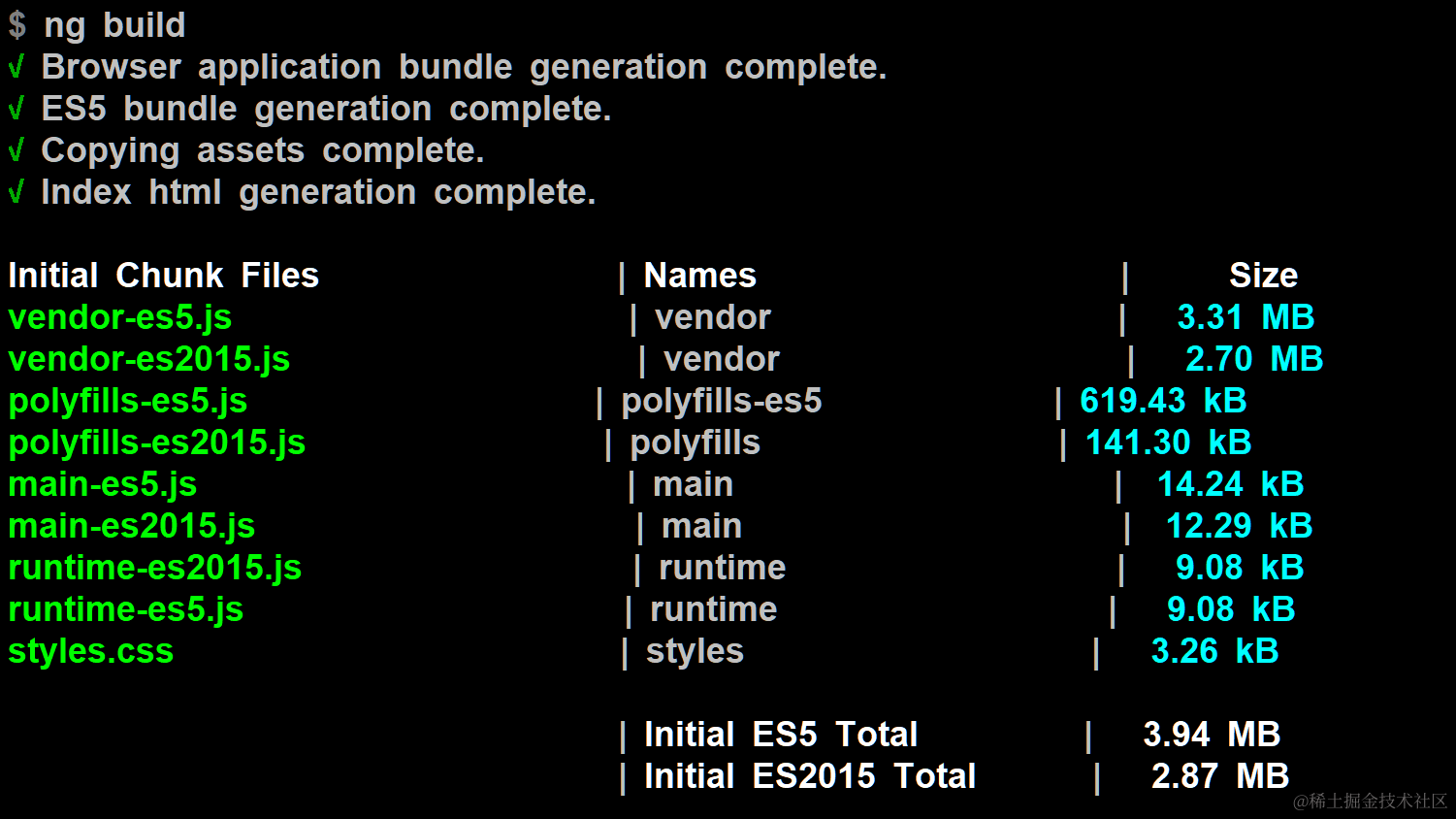 我们在Angular项目里执行命令行ng build,即可查看打包出来的chunk名称和对应的大小,如下图所示。