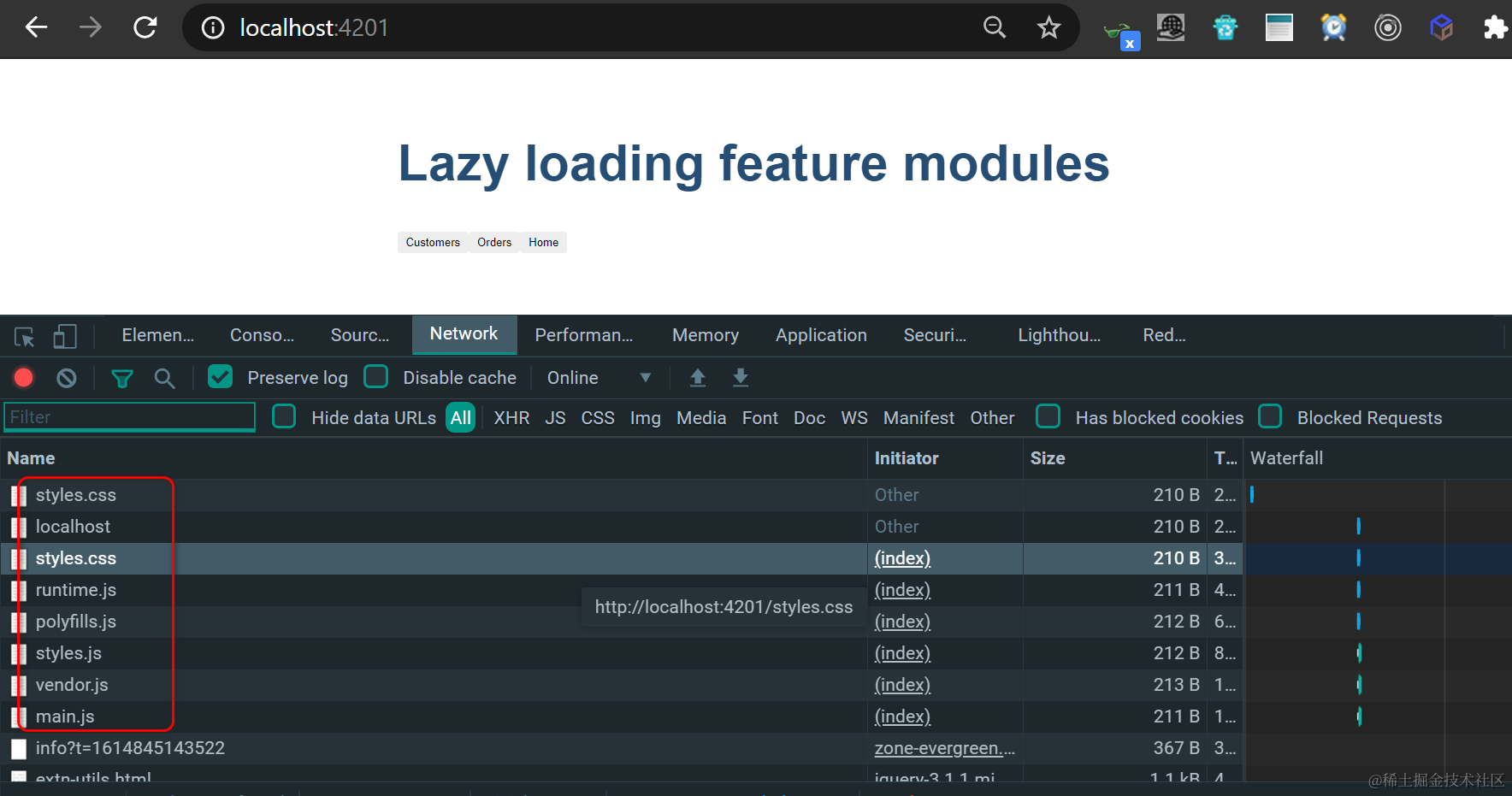 在运行时能看得更清楚。浏览器里访问应用,因为没有打开customers或者orders页面,因此没有加载对应的chunk: