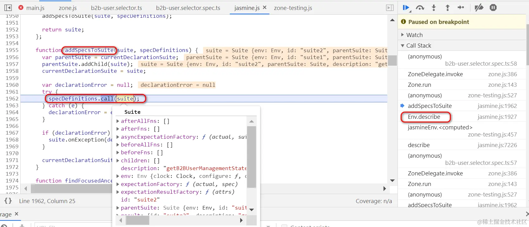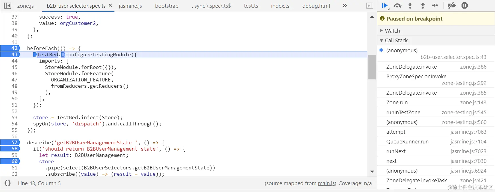 然后执行beforeEach,这是一个异步调用。从调用栈很难能够分辨出这个beforeEach具体是被谁调用的: