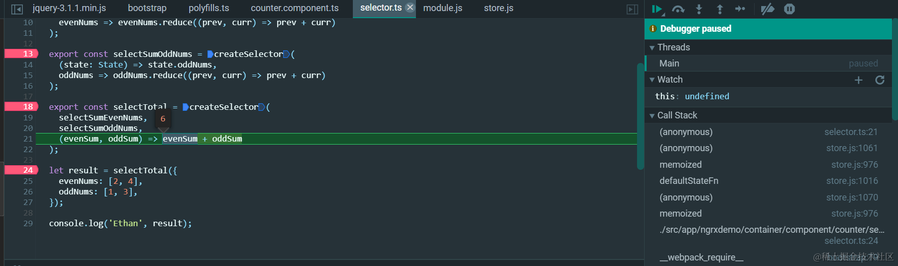 名为selectTotal的这个复合selector的消费方式很特别,直接传一个初始state进去即可: