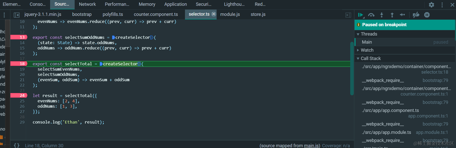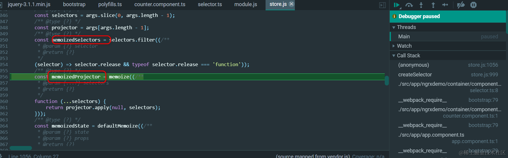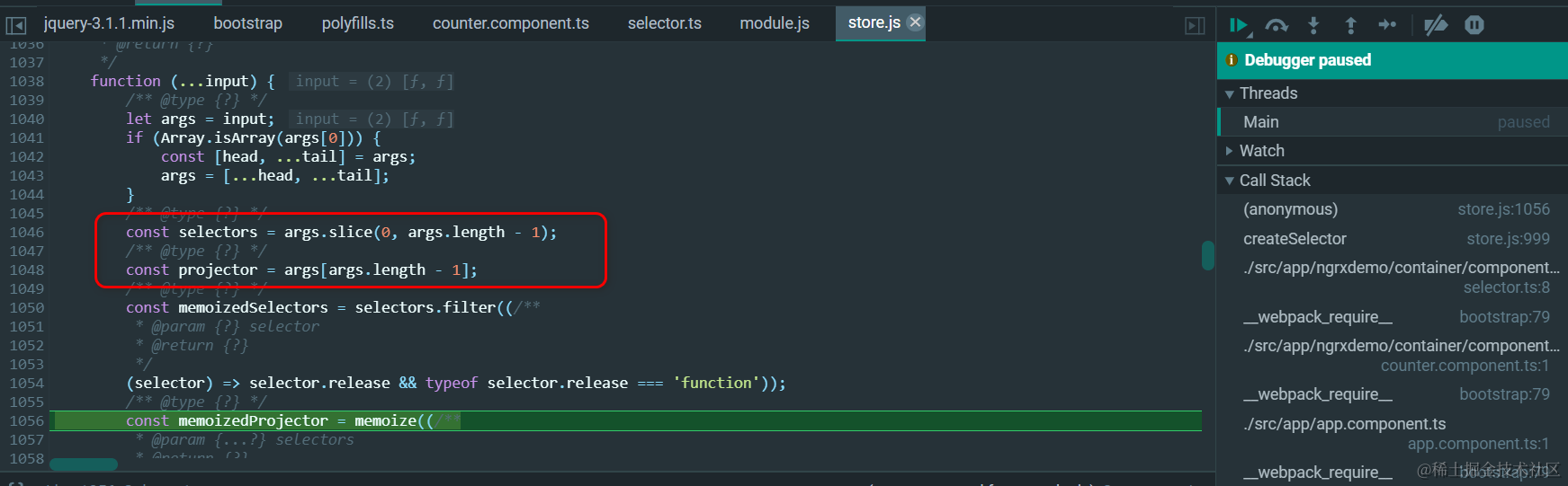 createSelector实现代码里,前面n - 1 个参数都是selector,只有最后一个是projection函数: