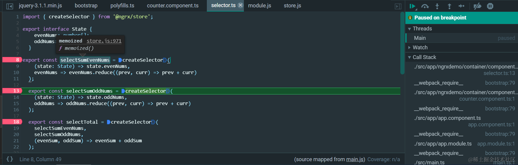 查看createSelector工具函数返回的构造而成的selector,从其实现源码能够判断出,这是一个具有记忆功能的selector: