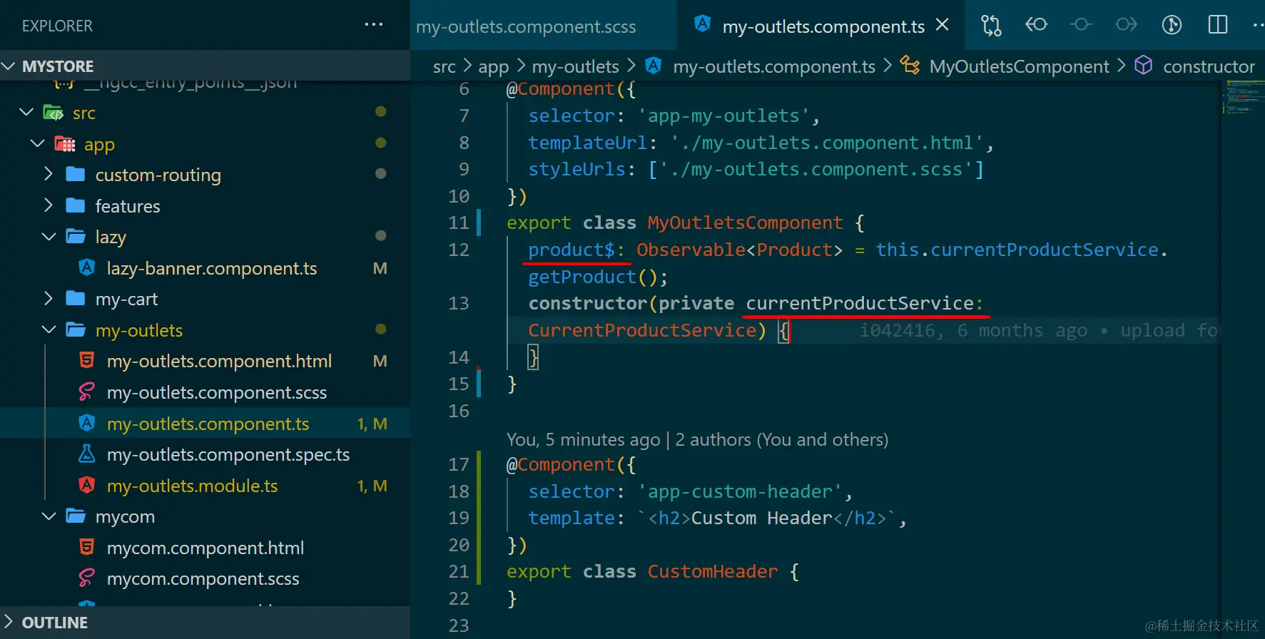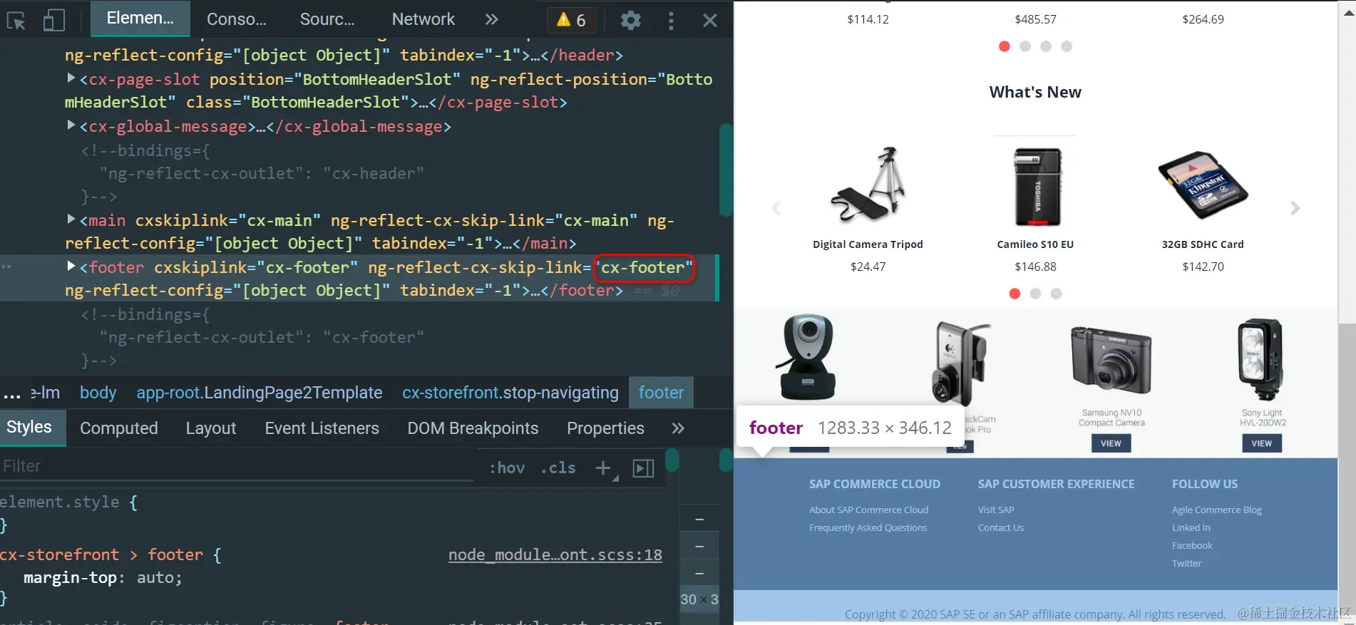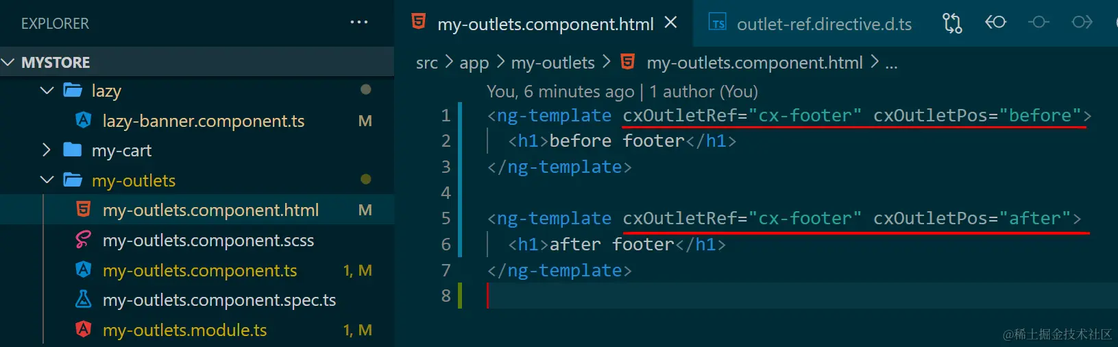 创建一个新的 Angular Component(类比 SAP CRM Fiori 的 View Fragment),在里面使用 cxOutletRef 指令,将两个新的字段 before footer 和 after footer,关联到 ID 为 cx-footer 的 Outlet 上(类比 SAP CRM Fiori 的 ExtensionPoint),出现的位置分别用 cxOutletPos 指定成 before 和 after,即希望这两个扩展字段,分别出现在 SAP Commerce Cloud footer 区域之前和之后。