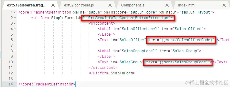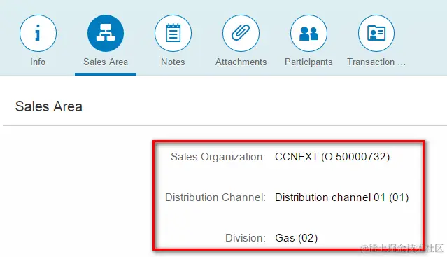 然后将该 view fragment 配置到 salesAreaInfoTabContentBottomExtension 上即可。最后,包含在 view fragment 里的自定义字段,就会出现在 Fiori 应用 Sales Area 面板的对应位置,如下图所示: