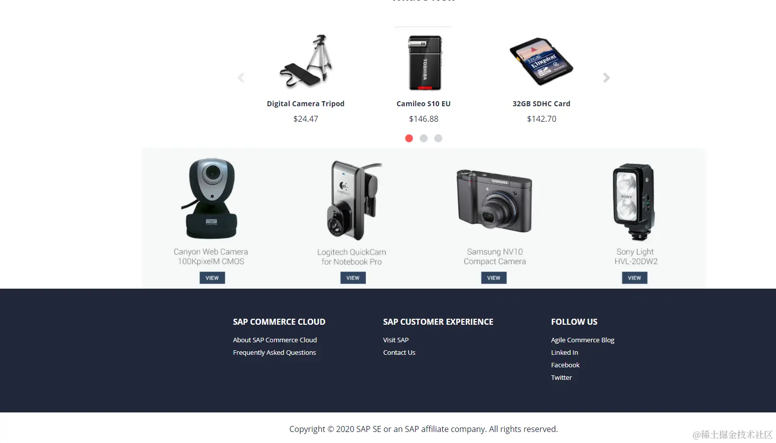 下图黑色区域是 SAP 电商云的 footer 区域,假设我们需要在 footer 区域的顶部和尾部,再增添一些自定义字段。换个更技术一些的说法,我们需要基于自定义字段上下文,即 Outlet = footer 的 UI 区域,创建一些自定义字段。