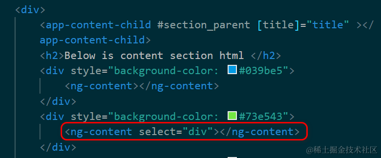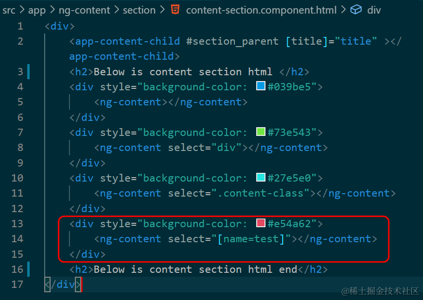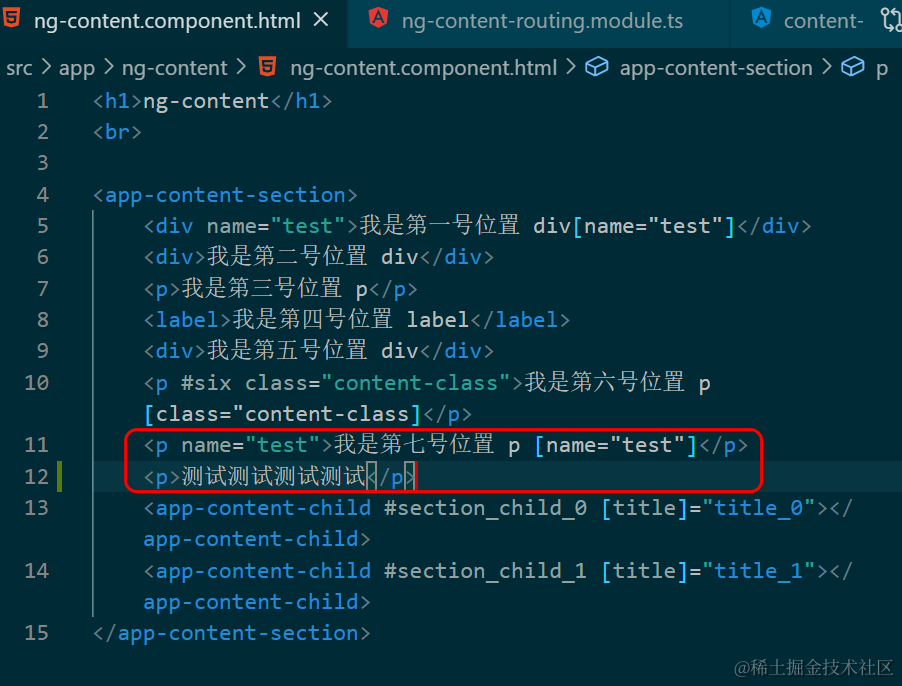 其中属性为name,值为test的p节点,会落在app-content-section里定义的红色div内。而测试测试测试,会落在蓝色div内。