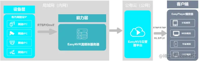 针对以上需求,基于TSINGSEE青犀视频现有产品,我们发现EasyNVR视频边缘计算平台(网页端+APP端)+EasyNVS(云端管理平台)结合方案十分适合这样的场景,通过用户管理及设备管理,实现接入设备统一管控、指定家长观看指定班级视频。EasyNVR负责设备的接入,视频流的分发,EasyNVS实现内外网的互通互联,实现云端的统一管控。同时直播、回看等功能接口齐全,可任意调用集成,如APP、学校教务系统、公众号、小程序等。