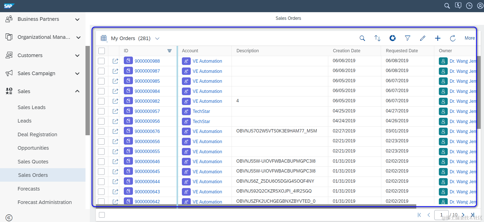 SAP Cloud for Customer UI上的数据采取分页显示,总共281条sales order,分10页显示,每页显示30条数据: