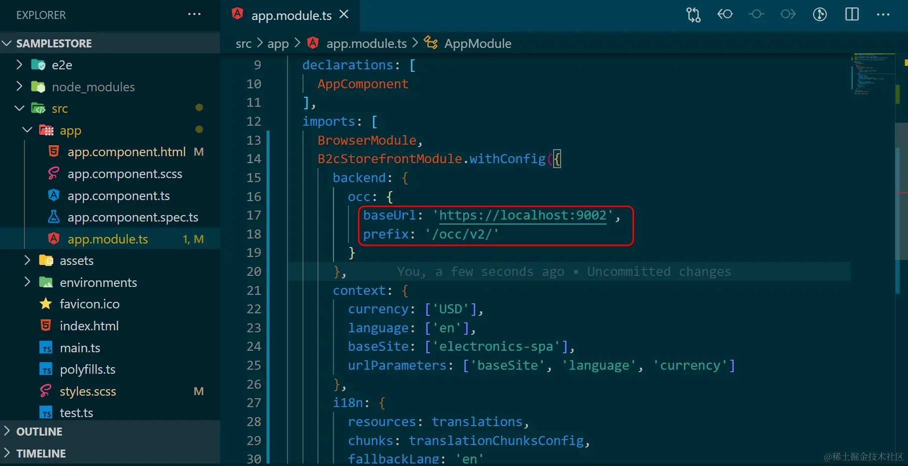 所有的命令行成功执行完毕后,打开 app.module.ts 文件,将配置节点 backend.occ.baseUrl 字段指定为我们本地安装的 SAP Commerce 实例即可: