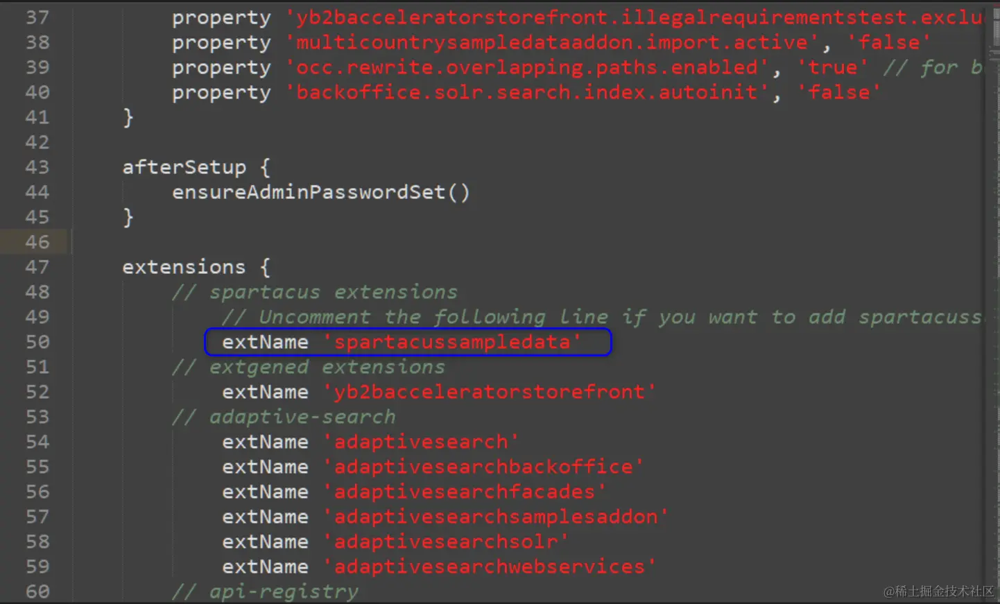 将该 recipes 目录内的 build.gradle 文件内,extensions 列表区域的 spartacussampledata 的注释去掉,从而让该 recipes 启用对 SAP Spartacus 的支持。