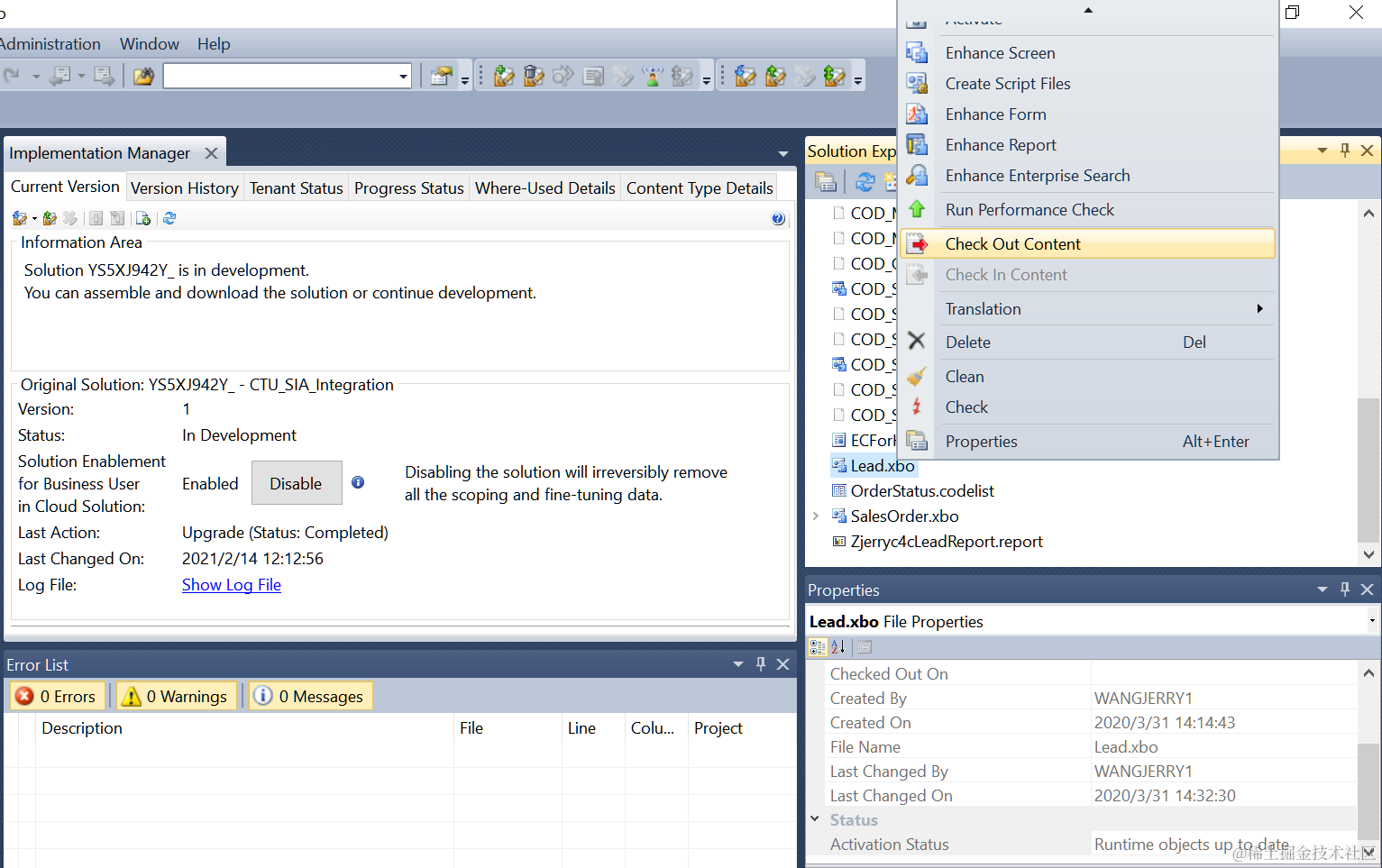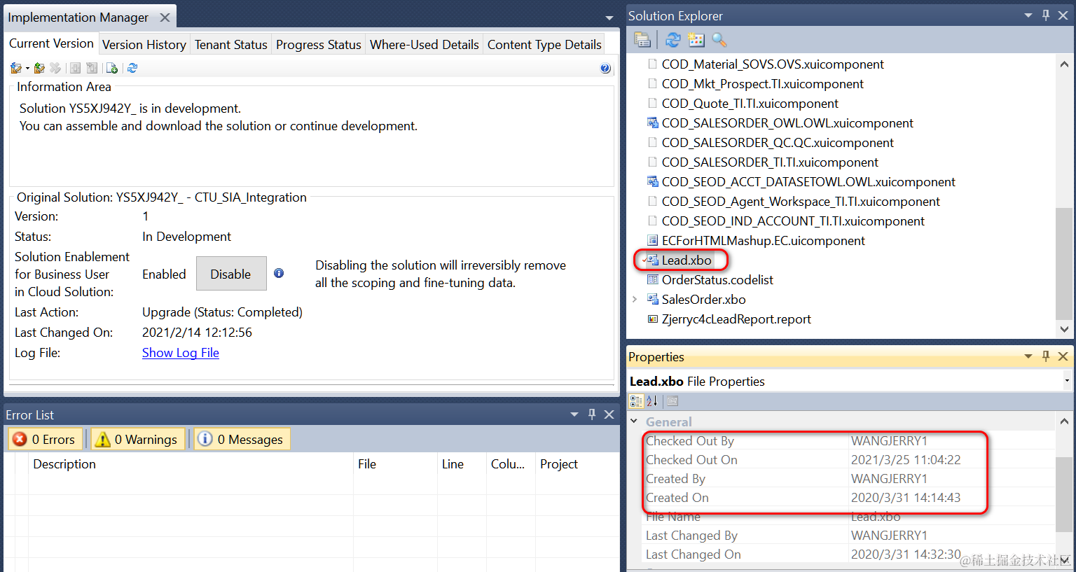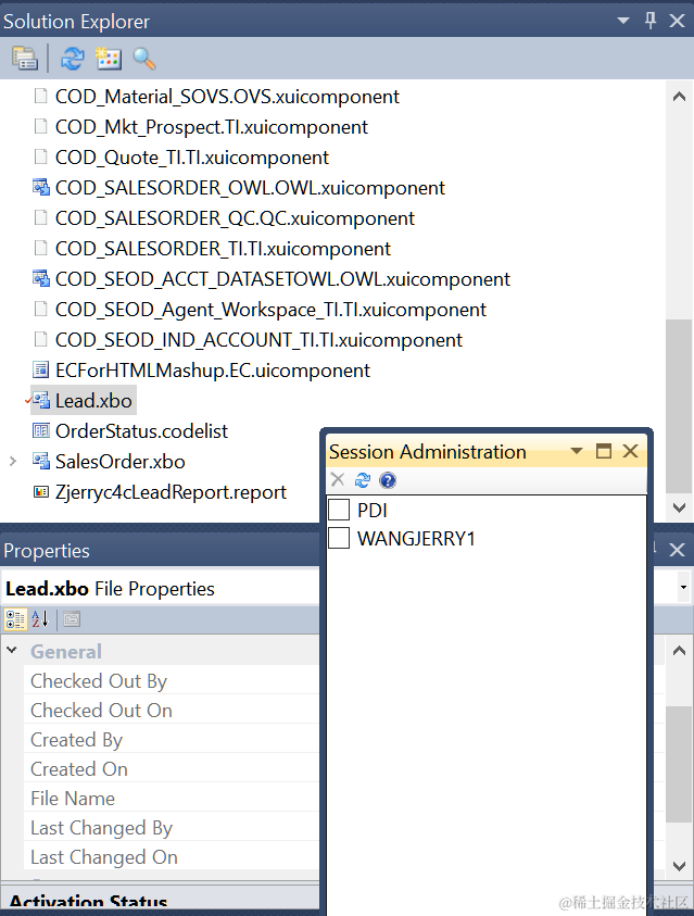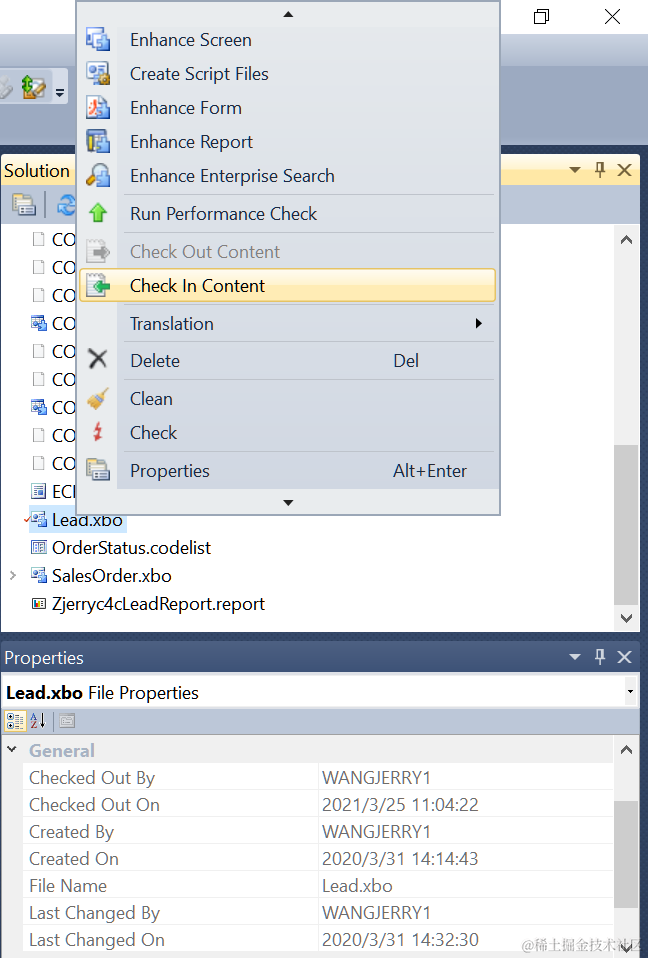 Items that you have checked out (for example, when changing them) are locked by you and other users cannot edit these items. A red check mark identifies items that you have checked out. When you have finished editing an item, you can check it in to make it available for other users to edit. You can also check in all items at the same time by right-clicking the solution and selecting Check In All Files. Items checked out by other users are identified by a blue user icon. The Properties window displays the user that has checked out the items.