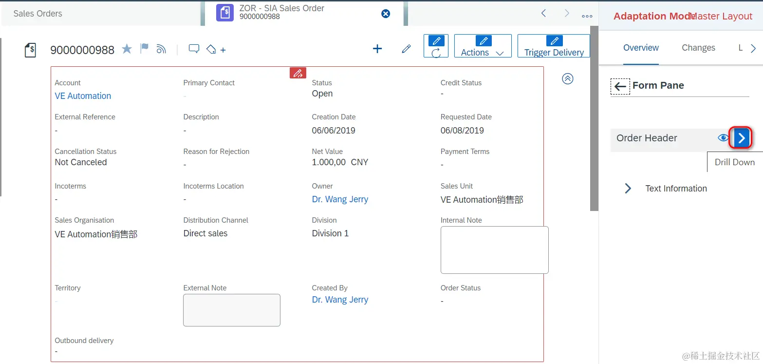 进入order header区域,点击drill down: