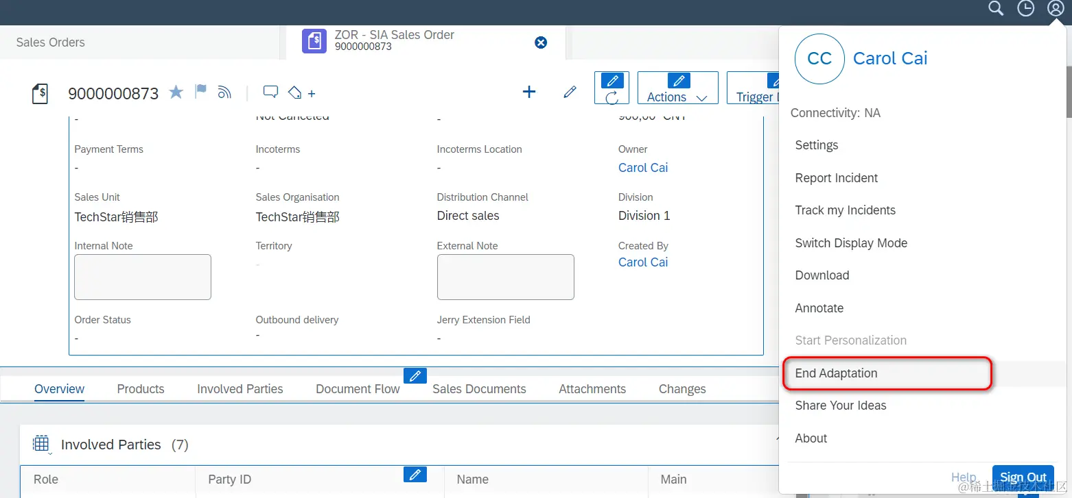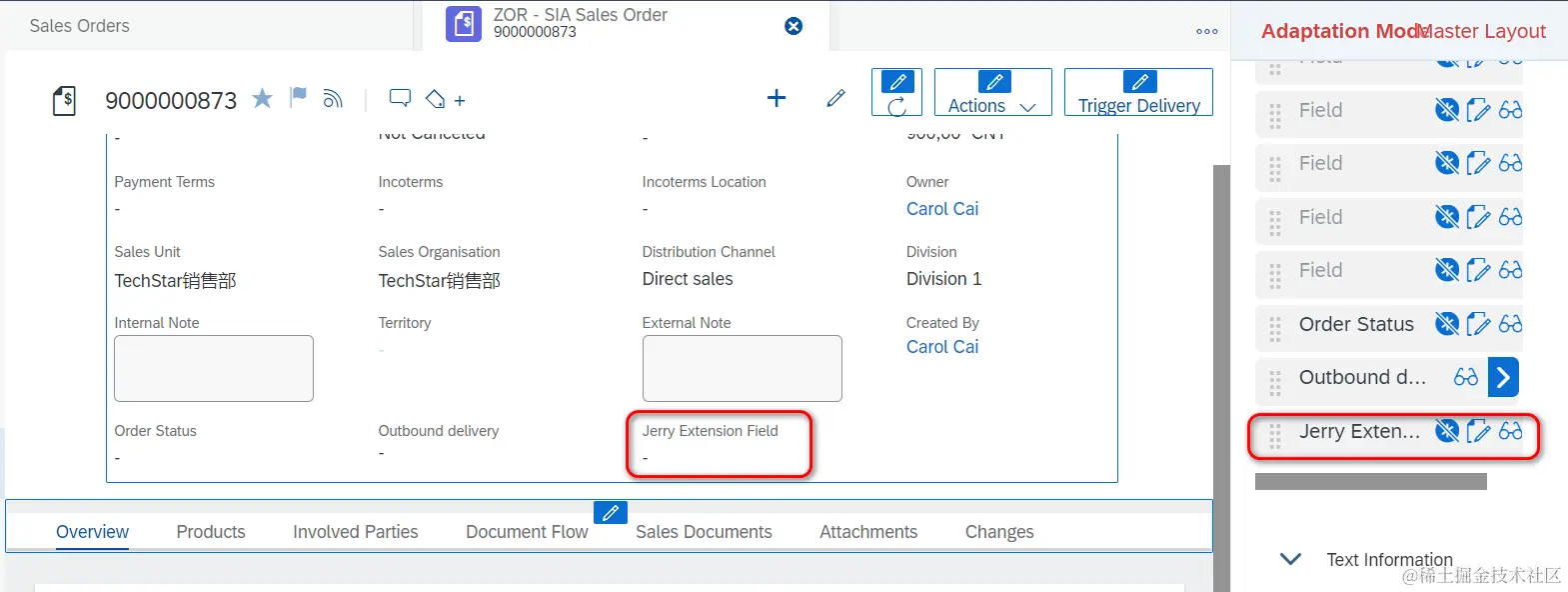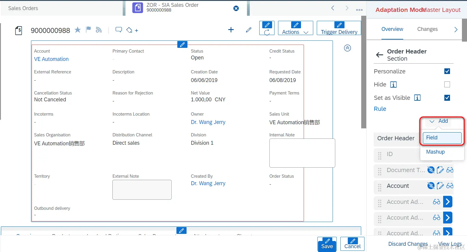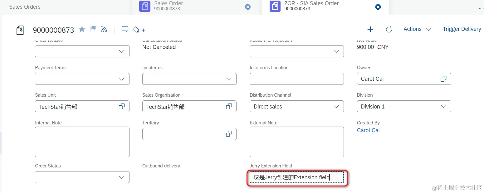 维护Business Context,即该扩展字段,会出现在Sales Order UI的general Information区域。设定Extension field的Label和数据类型Type. Technical Name会根据Label自动决定出来。
