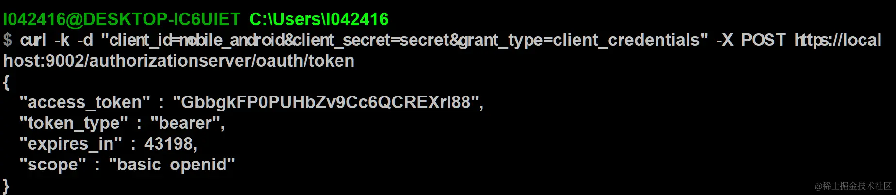 curl -k -d “client_id=mobile_android&client_secret=secret&grant_type=client_credentials” -X POST https://localhost:9002/authorizationserver/oauth/token