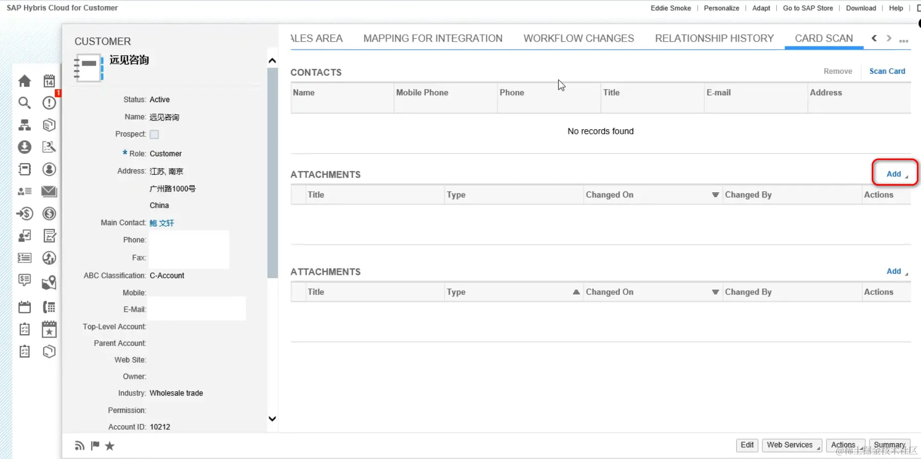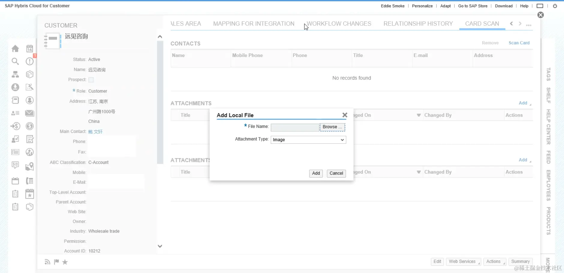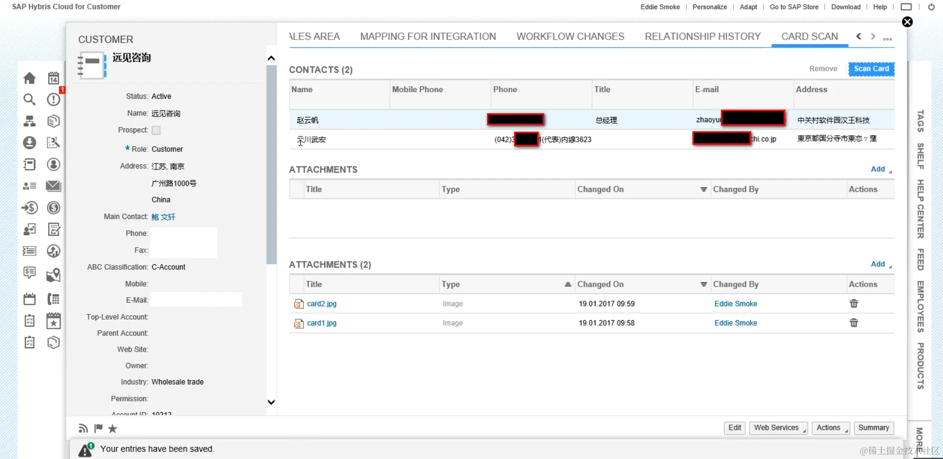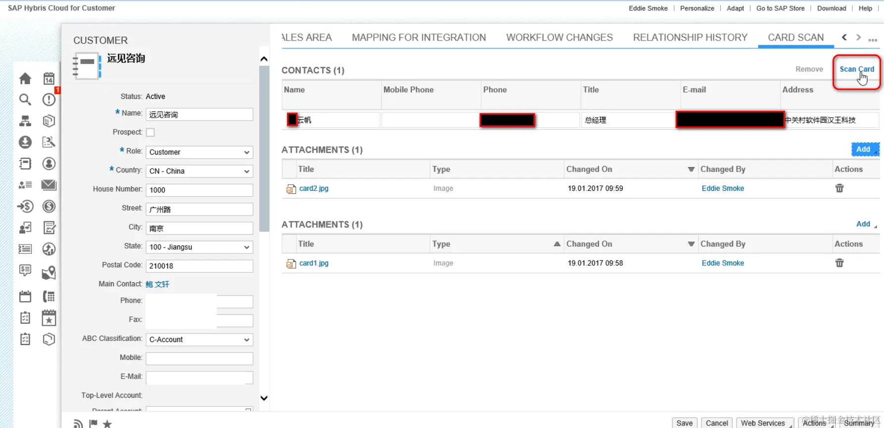 SAP成都研究院小伙伴们开发的一个SAP C4C POC - 通过名片扫描的方式录入联系人数据到系统 已注销 2021-04-26 137 阅读1分钟 该POC实现的功能:通过名片扫描的方式录入联系人数据到系统,由SAP成都研究院Cloud for Customer开发团队开发。 登录C4C系统,选择Card Scan工作中心: 通过C4C标准的attachment控件将需要扫描的名片以图片的格式上传到SAP C4C系统: 待扫描的图片如下: 名片上传成功之后,点击Scan Card按钮: 扫描完毕后,名片信息自动录入C4C系统,成为Contacts数据: 更多Jerry的原创文章,尽在:“汪子熙”: