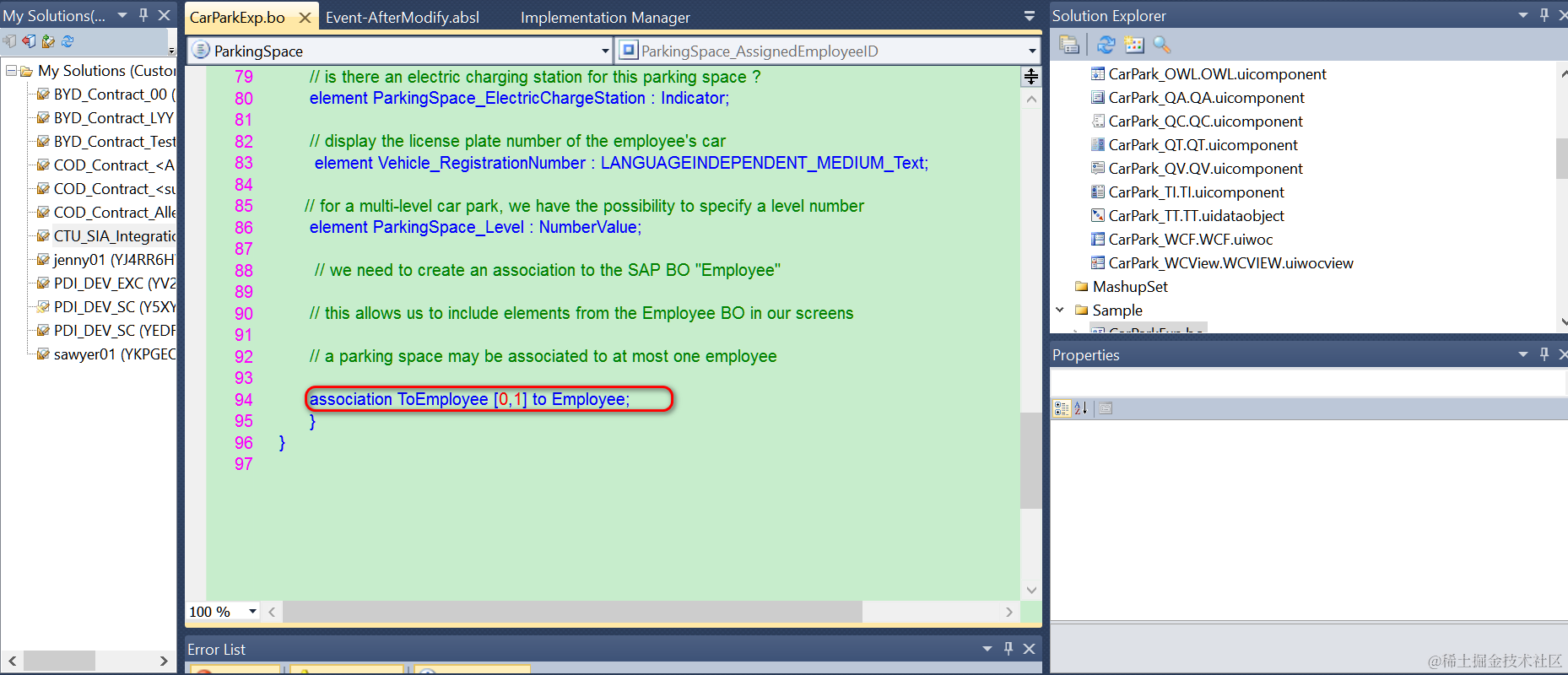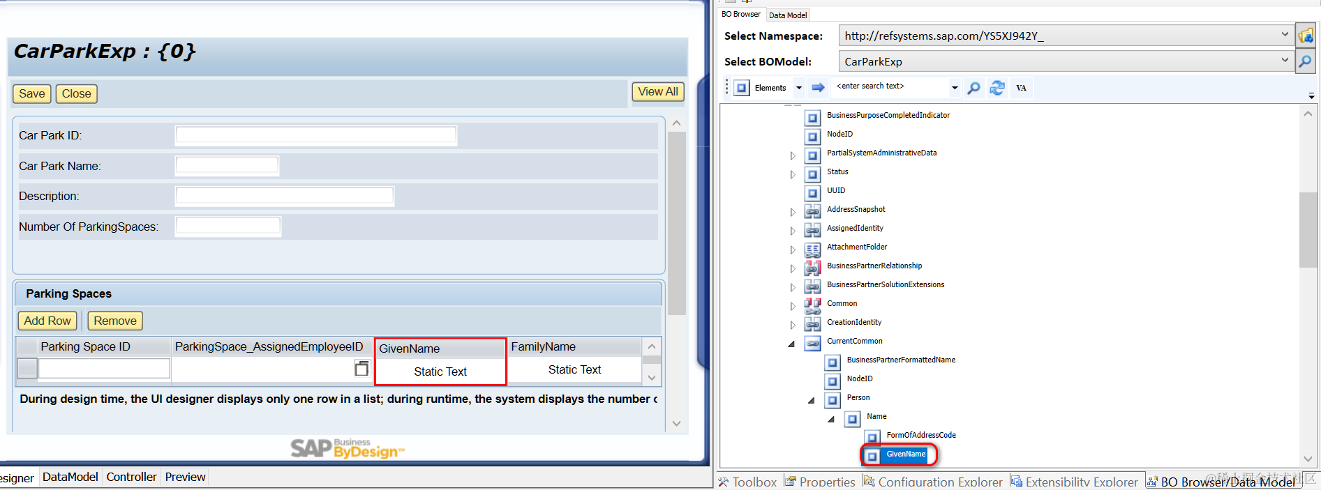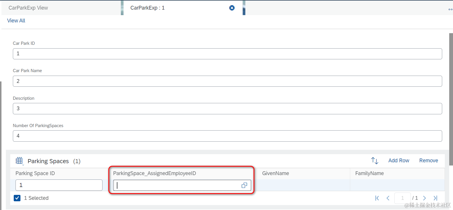 - 按照这篇文章SAP Cloud for Customer(C4C)里如何定义跨BO间的association的介绍,定义出ParkingSpace这个子节点和ToEmployee association: