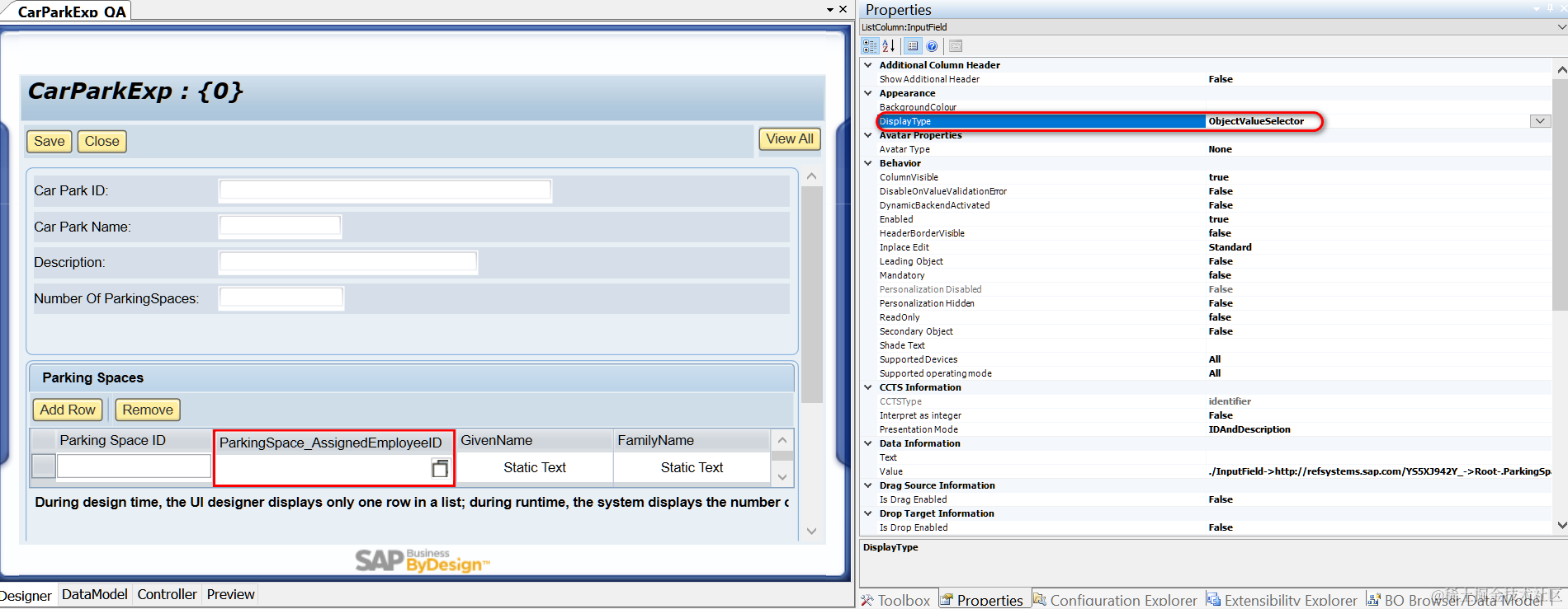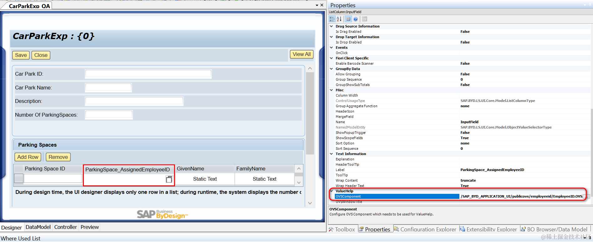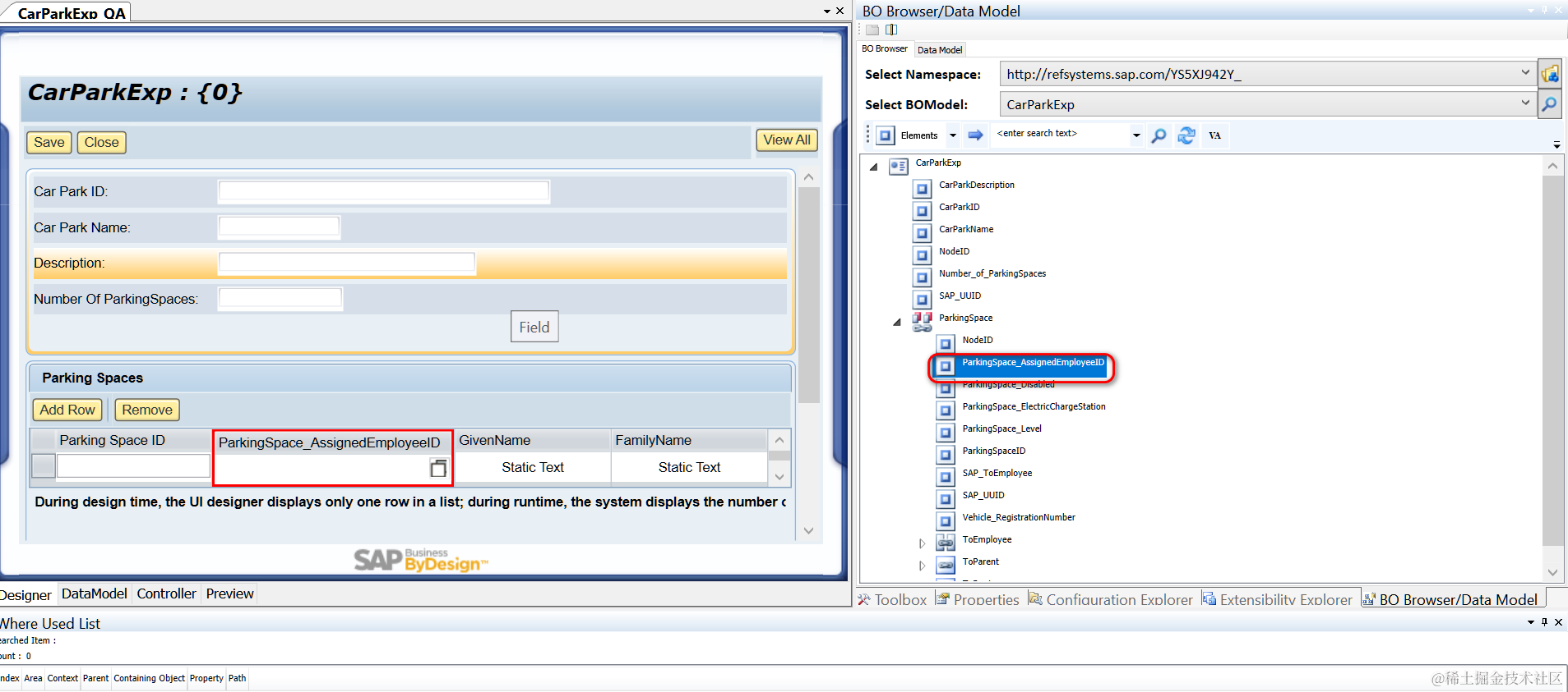 - 在UI Designer里,将要分配Object Value Selector的UI字段,绑定到BO 子节点ParkSpace的ParkingSpace_AssignedEmployeeID上去。