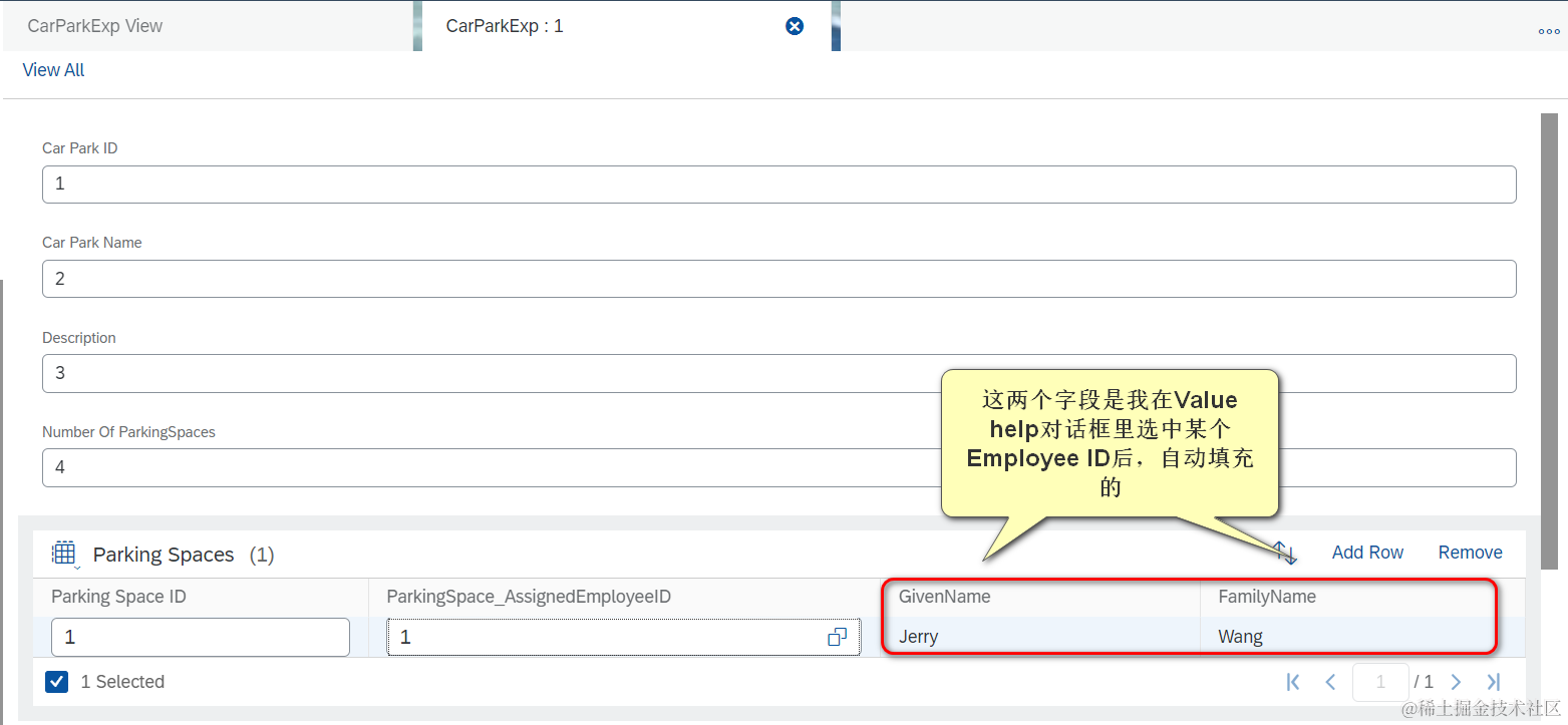 假设我选中ID为1的Employee,则其first name和last name,会自动填充到UI 对应字段上,即SAP 从业人员经常说的“自动带出来”。